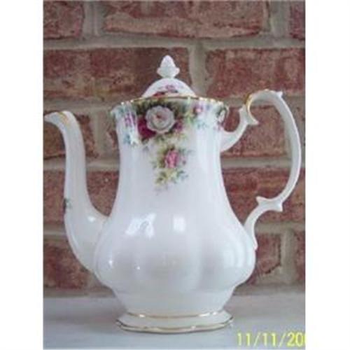 Royal Albert was originally founded as T.C. Wild & Sons in the 19th century. It prospered quickly, and in 1896 it took over a factory known as the Albert China Works. The "Albert" for which this company was named was named would later become King George VI, father of the current Queen Elizabeth II. Today, Royal Albert, Ltd. is part of the Royal Doulton Group. <p>This Celebration coffee pot from Royal Albert is typical of the types of floral patterns for which Royal Albert became famous. This particular pattern was very popular until it was discontinued in 2001, and is becoming increasingly harder to find.<p>This coffee pot stands 9 inches tall. It holds approximately .8 litre. It is in excellent undamaged condition.