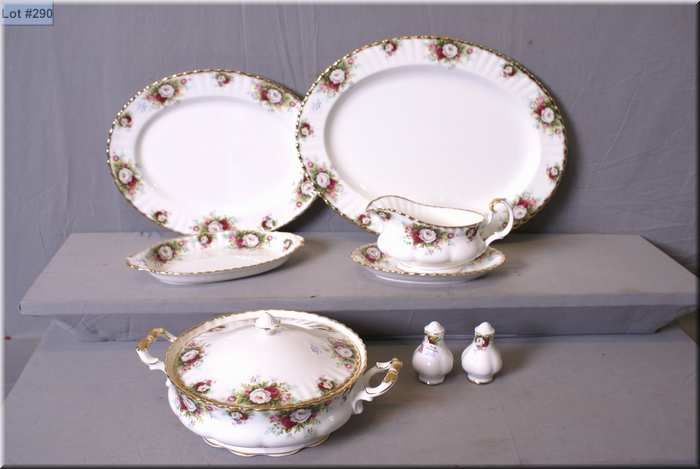 Royal Albert "Celebrations" serving pieces including two graduated serving platters, lidded vegetable dish, gravy boat and drip tray, salt and pepper plus open vegetable dish. Matches Lot 287