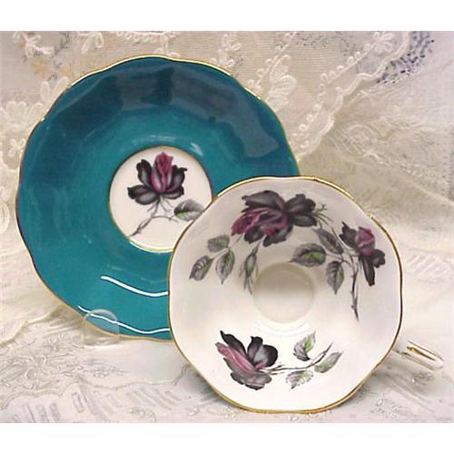 Gorgeous set! - Tea cup and matching saucer - Made by famous Royal Albert bone china, England - Wide open cup with scalloped body and fully decorated on inside featuring black roses - TRULY LOVELY! - Excellent Condition, but for a few tiny scratches on the saucer - Please include 7.00 for insured shipping - Thanks