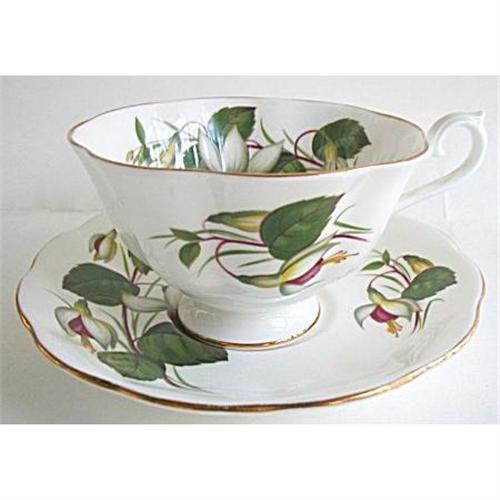Royal Albert beautiful cup and saucer set in the Fushia pattern. Fuchsia is wrote across the side of the saucer under the flower spray. The mark on back indicates this is post WW11. May be part of a series.