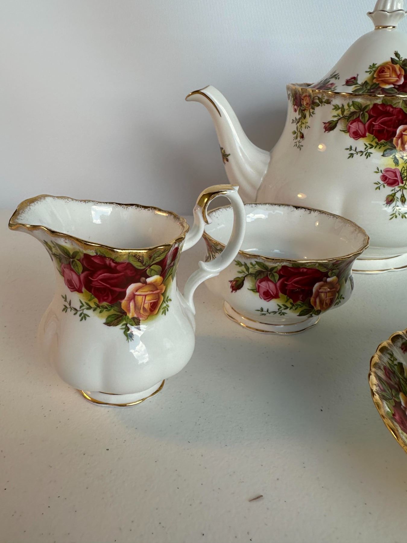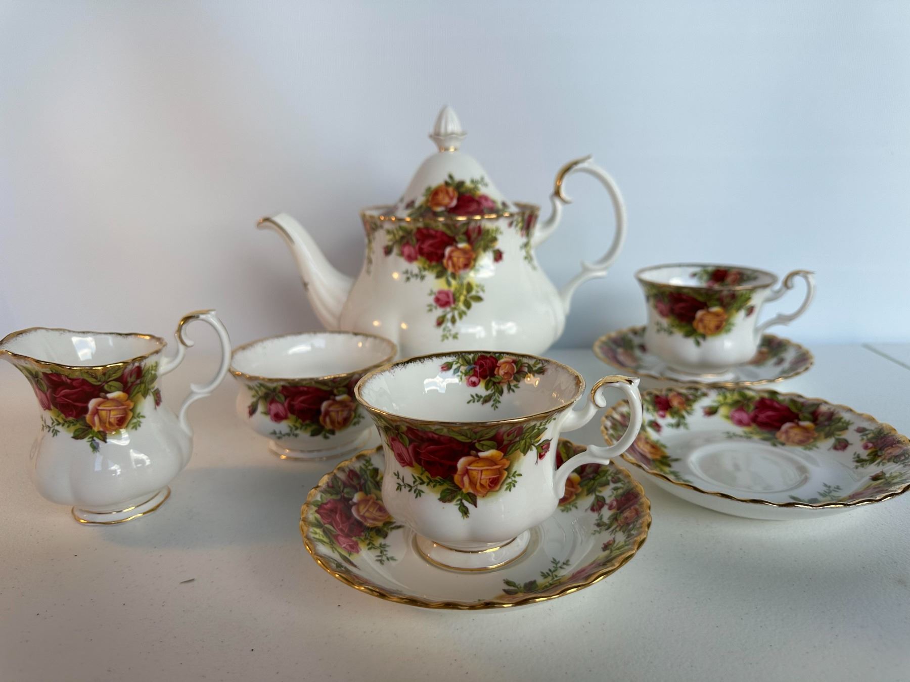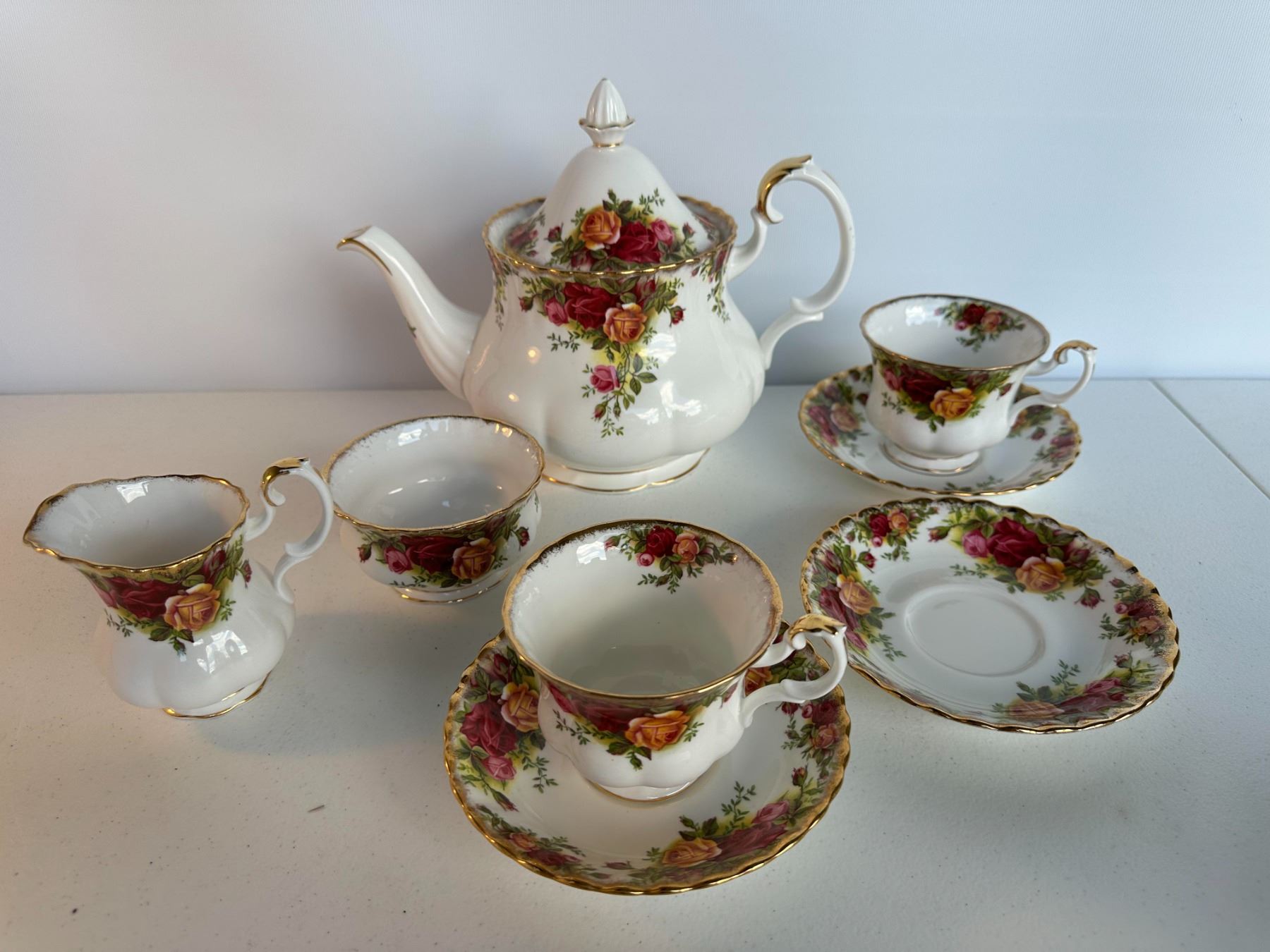 Partial tea service with teapot, cream jug, sugar bowl, and two teacup & saucer sets. Classic English pattern with roses and gold trim. Teapot approx.