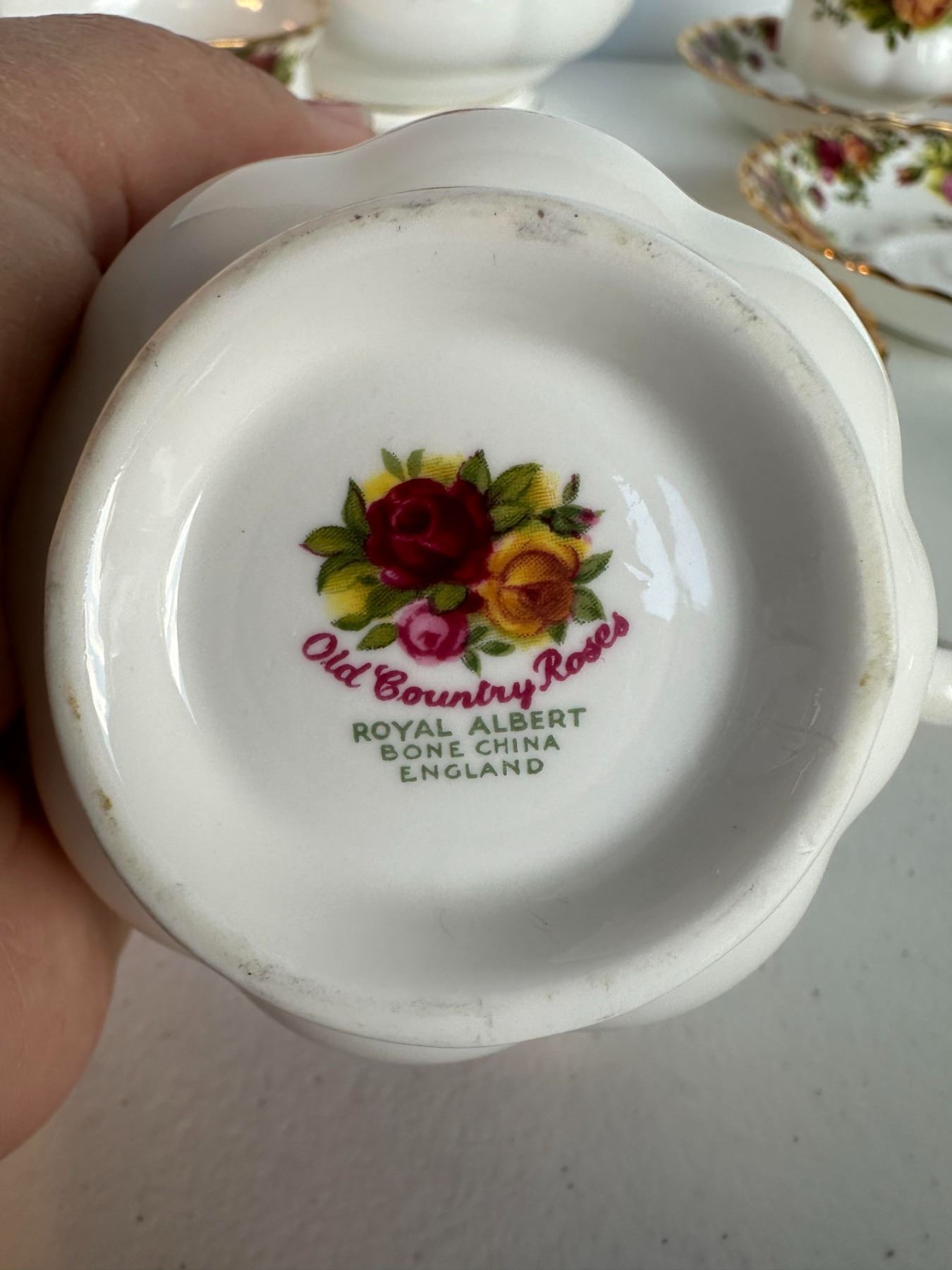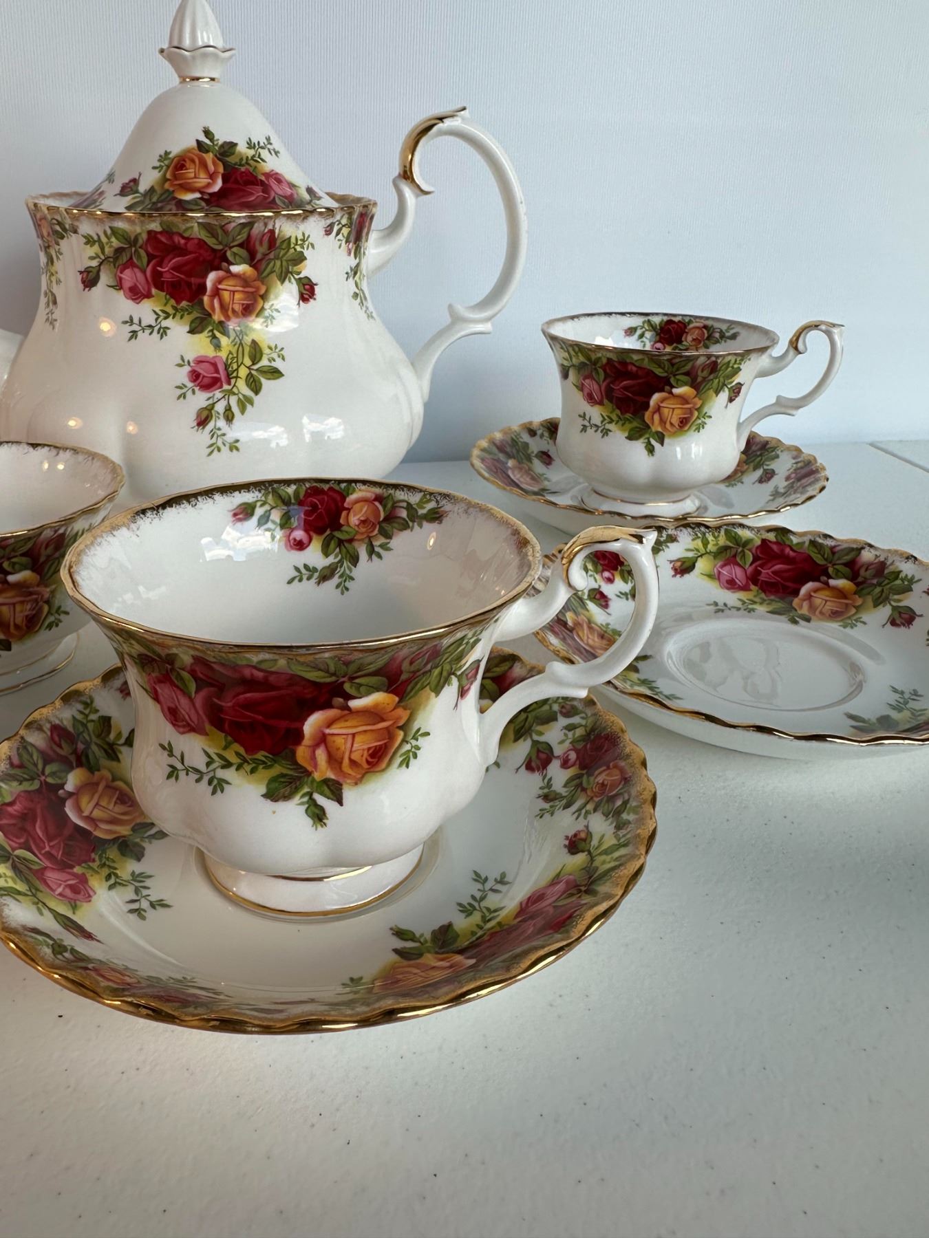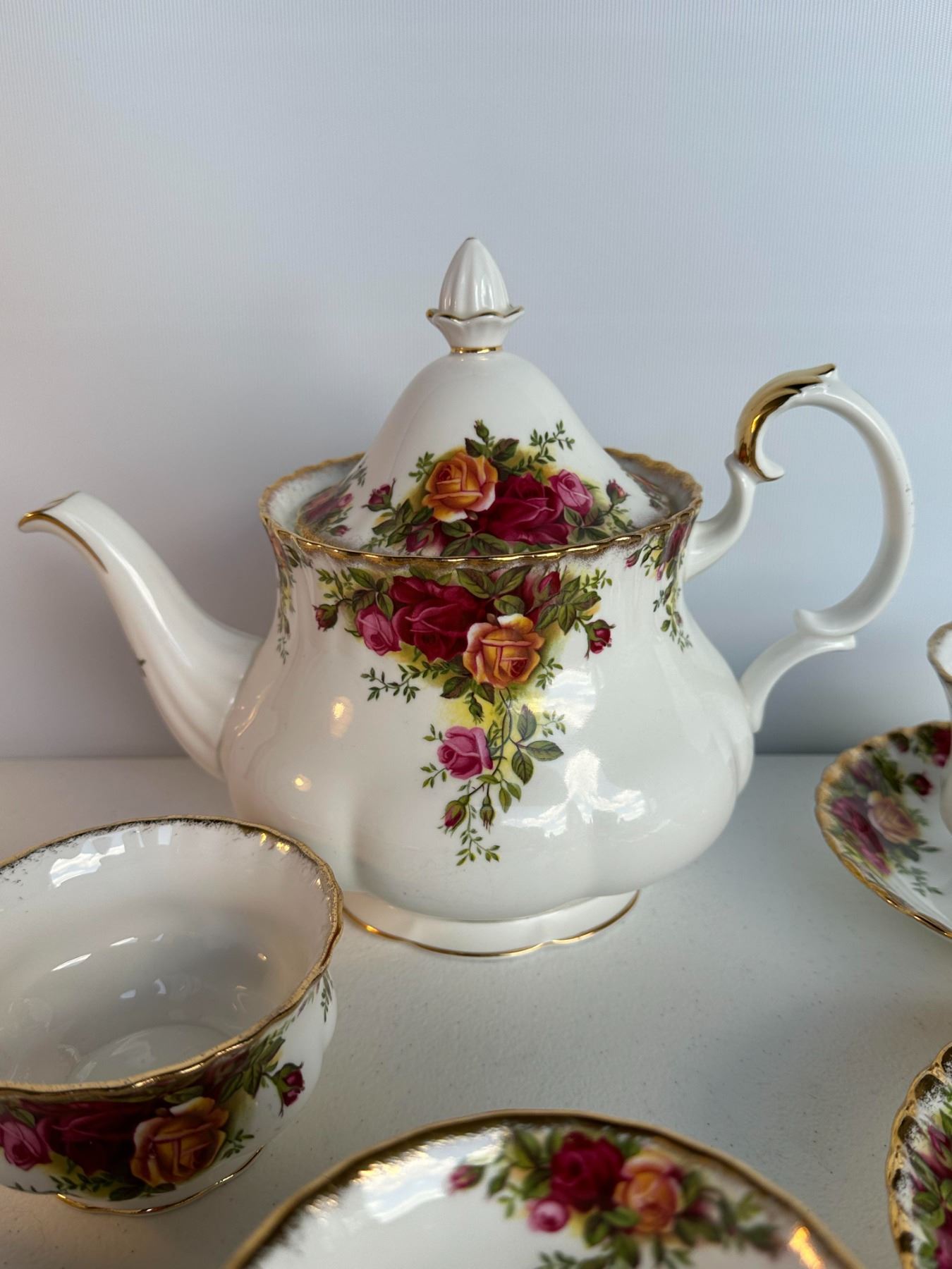 Partial tea service with teapot, cream jug, sugar bowl, and two teacup & saucer sets. Classic English pattern with roses and gold trim. Teapot approx.