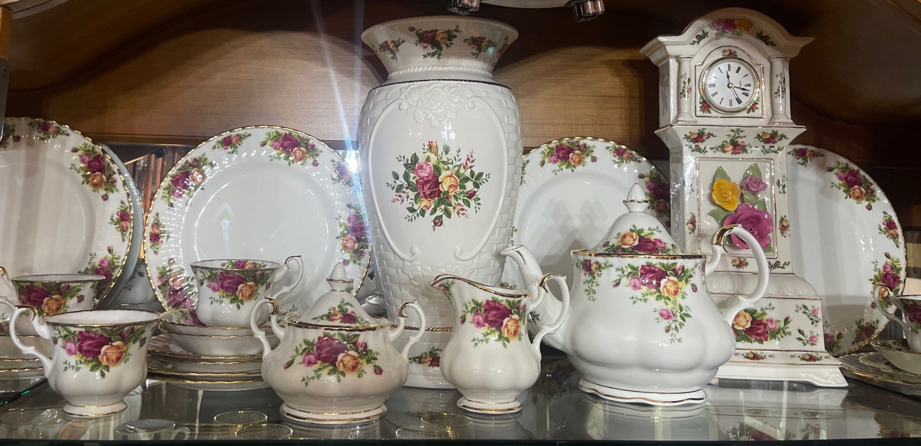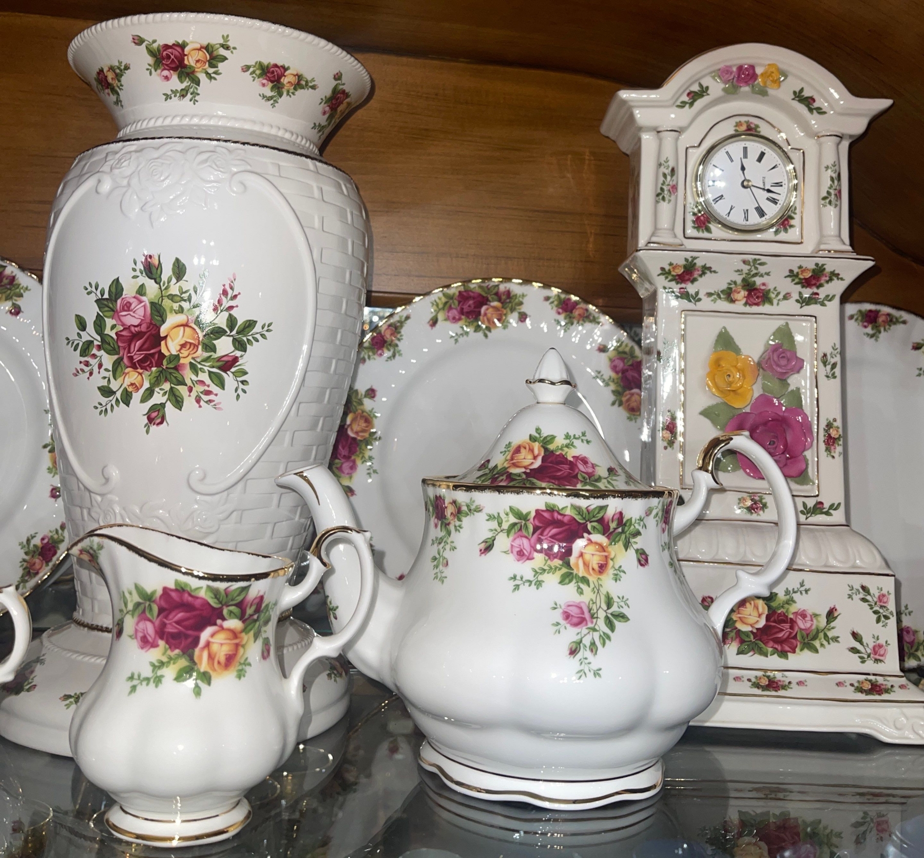 Royal Albert Old Country Roses Collection Clock, Tea Pot, 4 Plates, 4 Tea Cups, Large Vase
