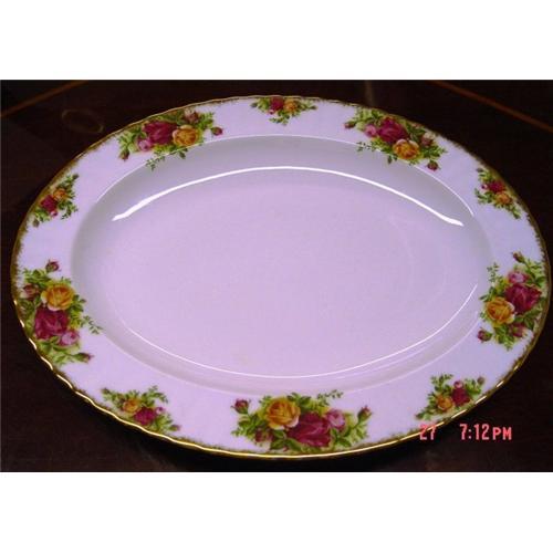 Royal Albert Large OVAL Serving Platter decorated with the beautiful vintage 'OLD COUNTRY ROSES' pattern. Vibrant color and 'like new' condition with 22kt gold trim. See photo 3 for a size comparison of the platter with the Oval Serving Bowl. No chips, cracks crazing or other flaws. Genuine English Bone China, Made in England. Each piece bears the original mark and copyright. ca 1962. Shipping, handling and insurance is $18.00 by USPS Priority Mail.