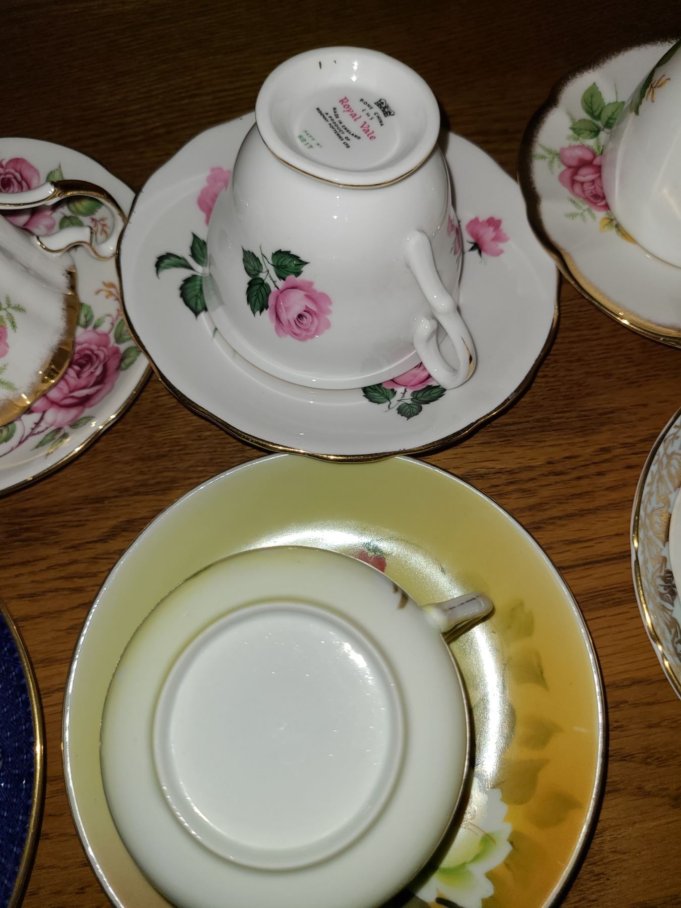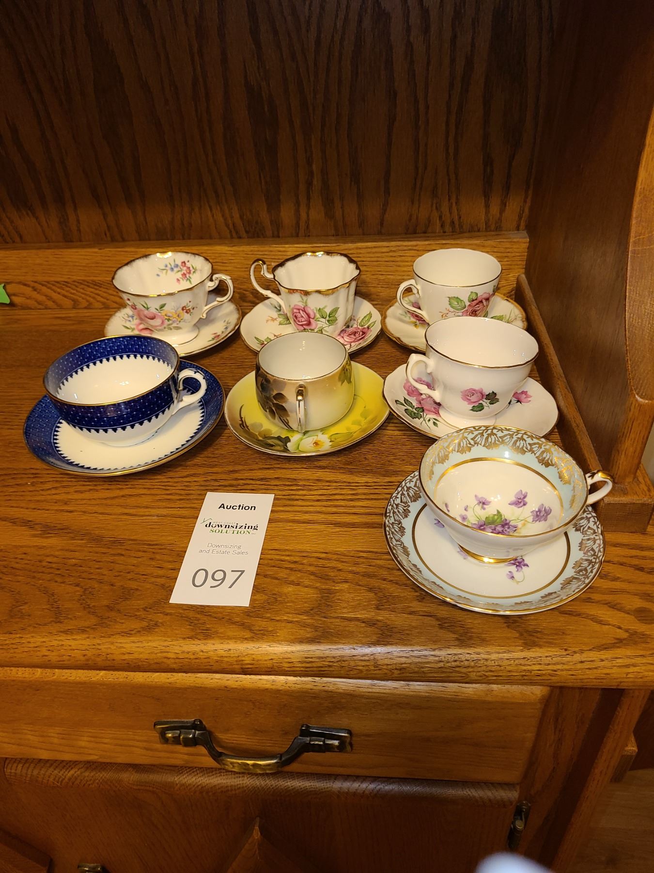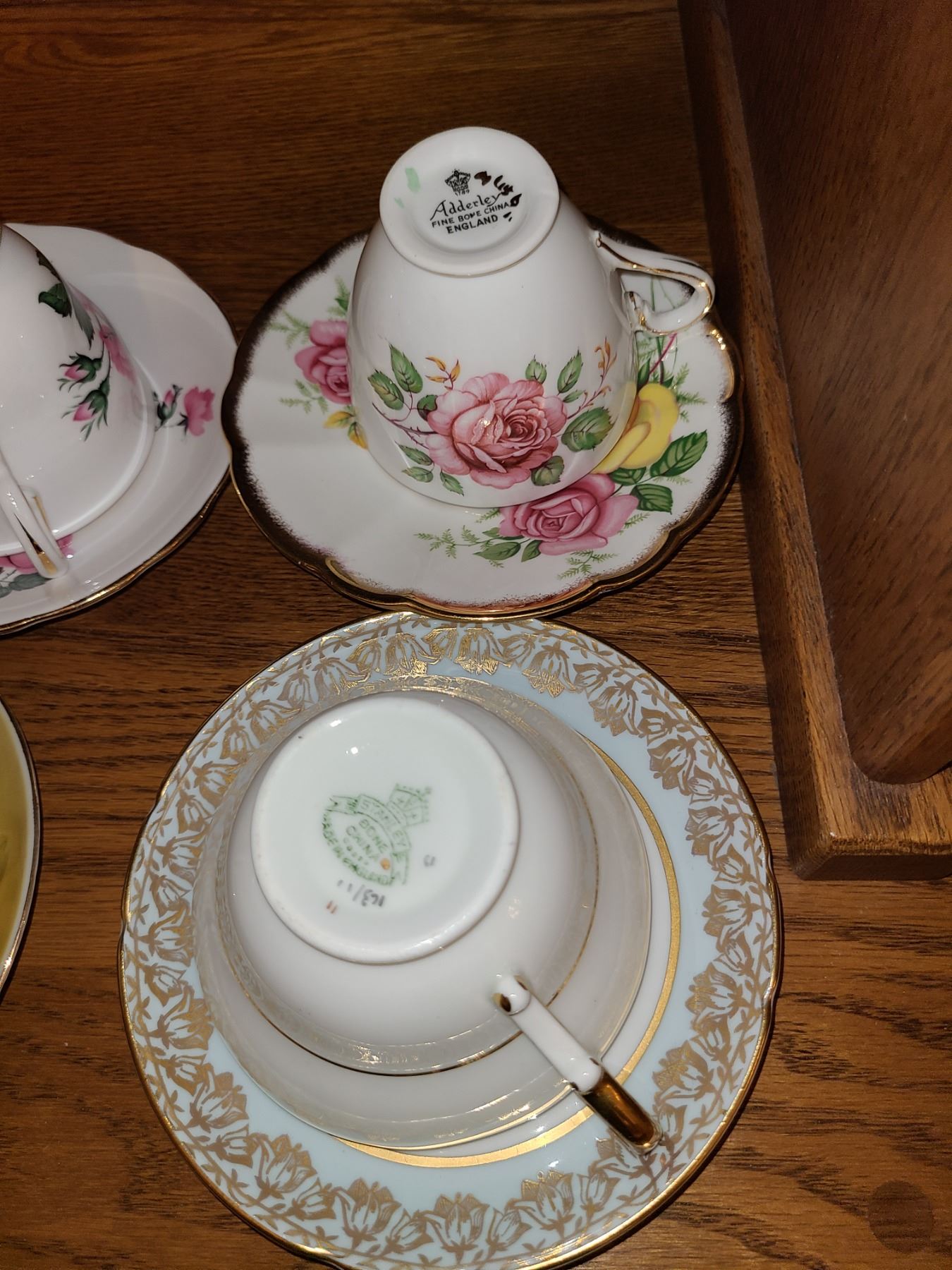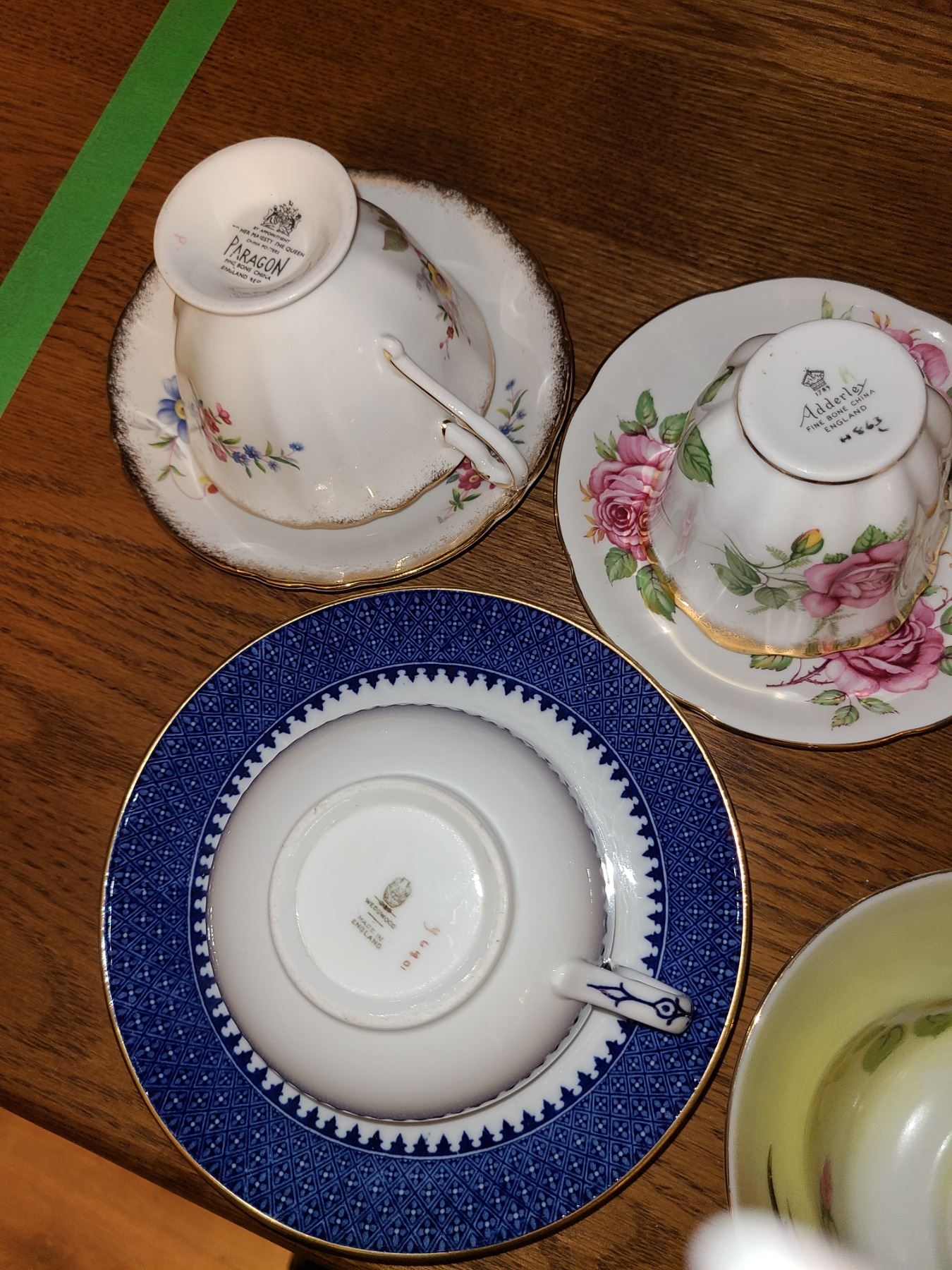 Cups and saucers by Royal Albert, Paragon, Adderley, Stanley, and more. Bring packing material. Pickup at 9 am.