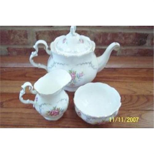 </font></strong>Royal Albert was originally founded as T.C. Wild & Sons in the 19th century. It prospered quickly, and in 1896 it took over a factory known as the Albert China Works. The "Albert" for which this company was named was named would later become King George VI, father of the current Queen Elizabeth II. Today, Royal Albert, Ltd. is part of the Royal Doulton Group. <p>The Tranquillity pattern is typical of the types of patterns for which Royal Albert became famous: brightly colored florals. This particular pattern is particularly sweet, with its small random clusters of pink roses and gray accents. <p>This tea set set consists of a large tea pot, a large cream jug, and a large sugar bowl. The tea pot holds 1.2 litres. The sugar bowl measures four and a half inches across. The cream jug stands 4.25 inches tall. All pieces are in excellent undamaged condition.</font>
