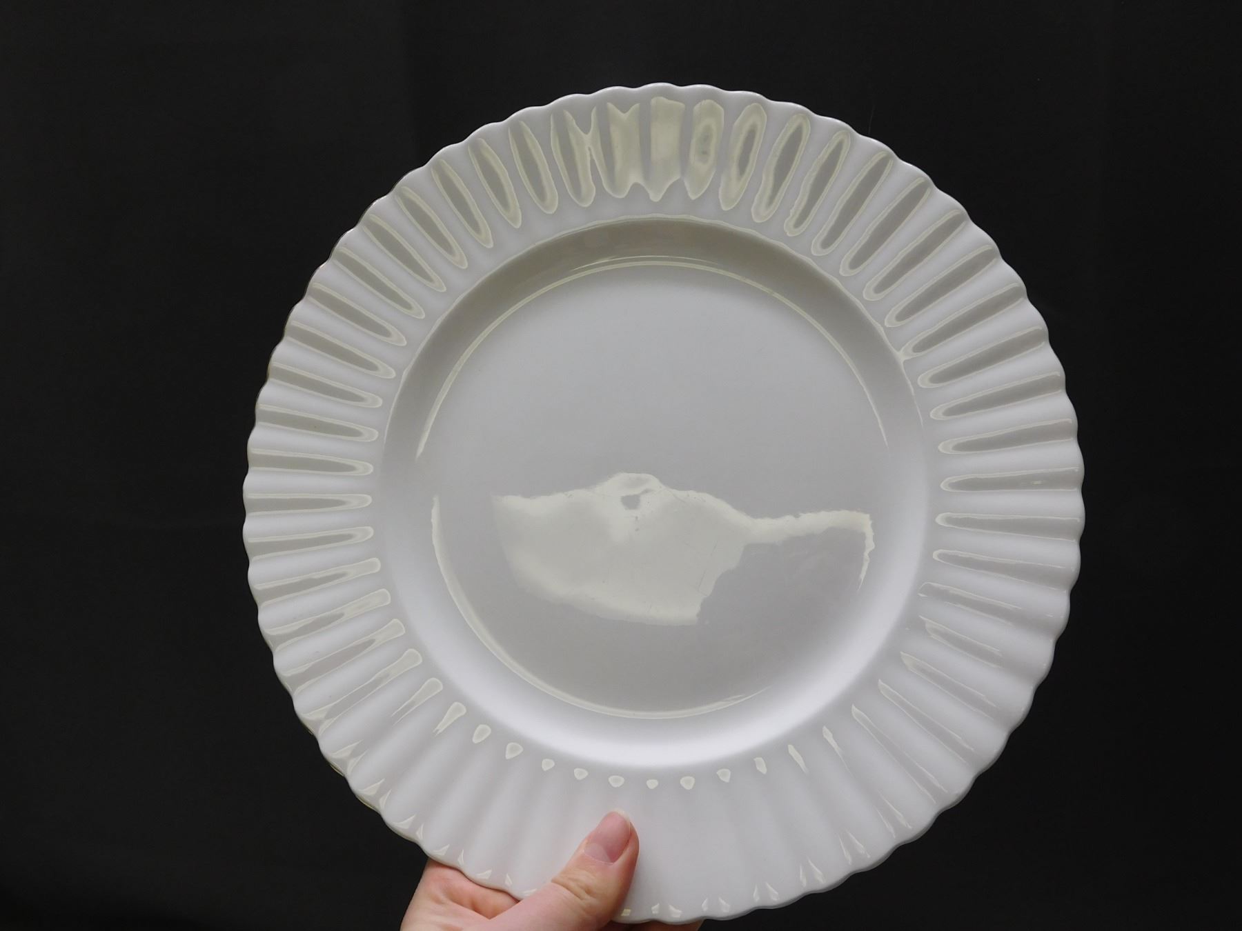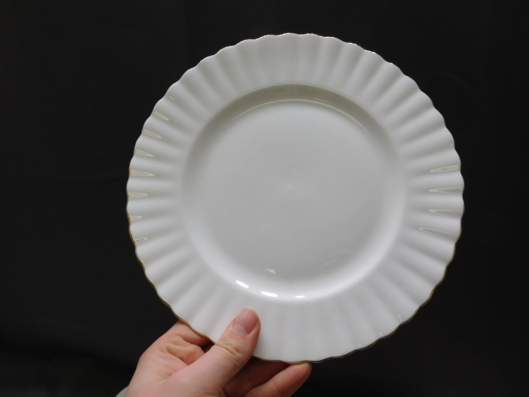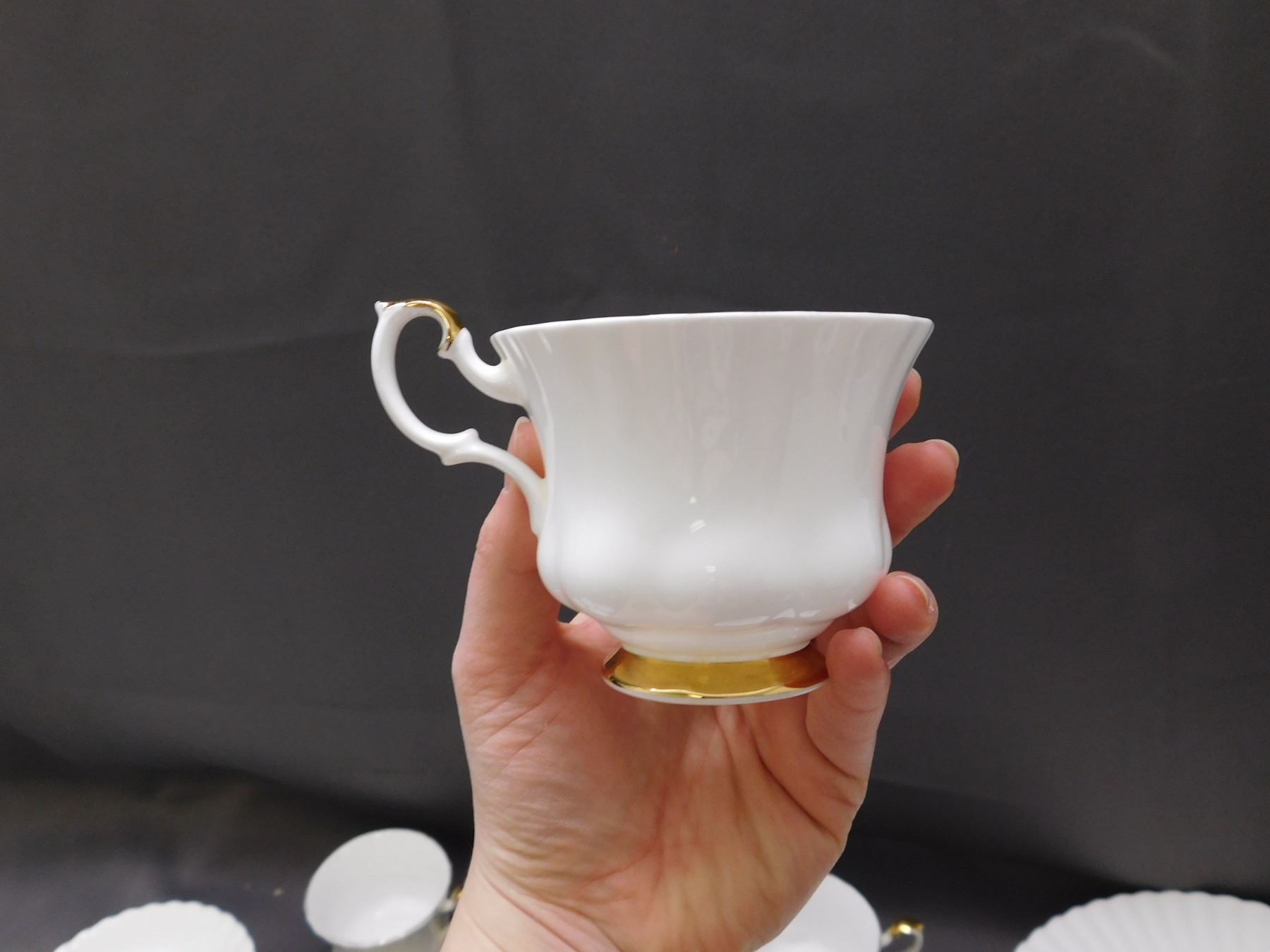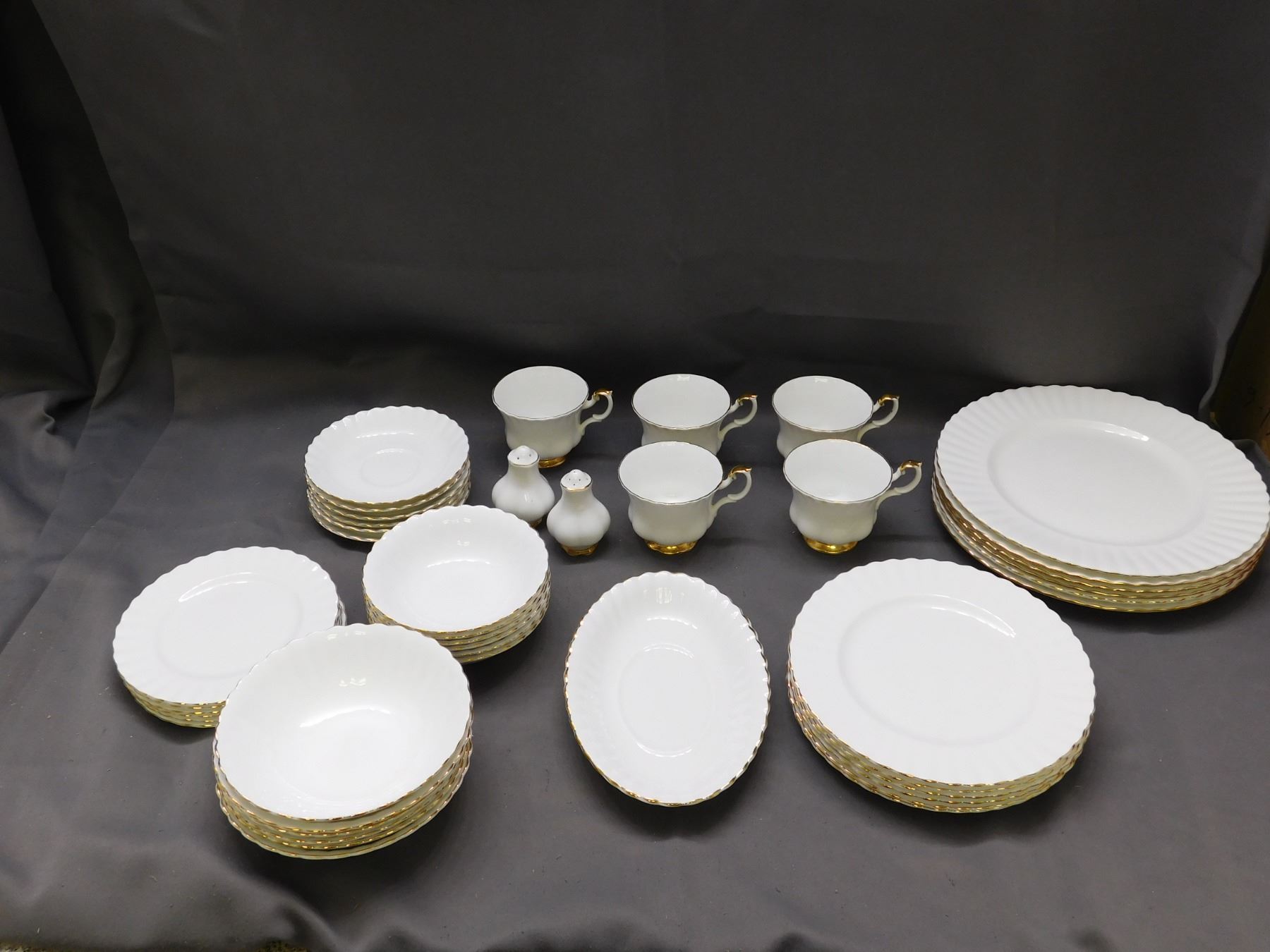 5 cups, 6 saucers, salt and pepper, 6 dinner plates, 5 soup bowls, 6 sides plates, 6 dessert bowls, 6 salad (1 chipped), gravy boat tray (no boat)