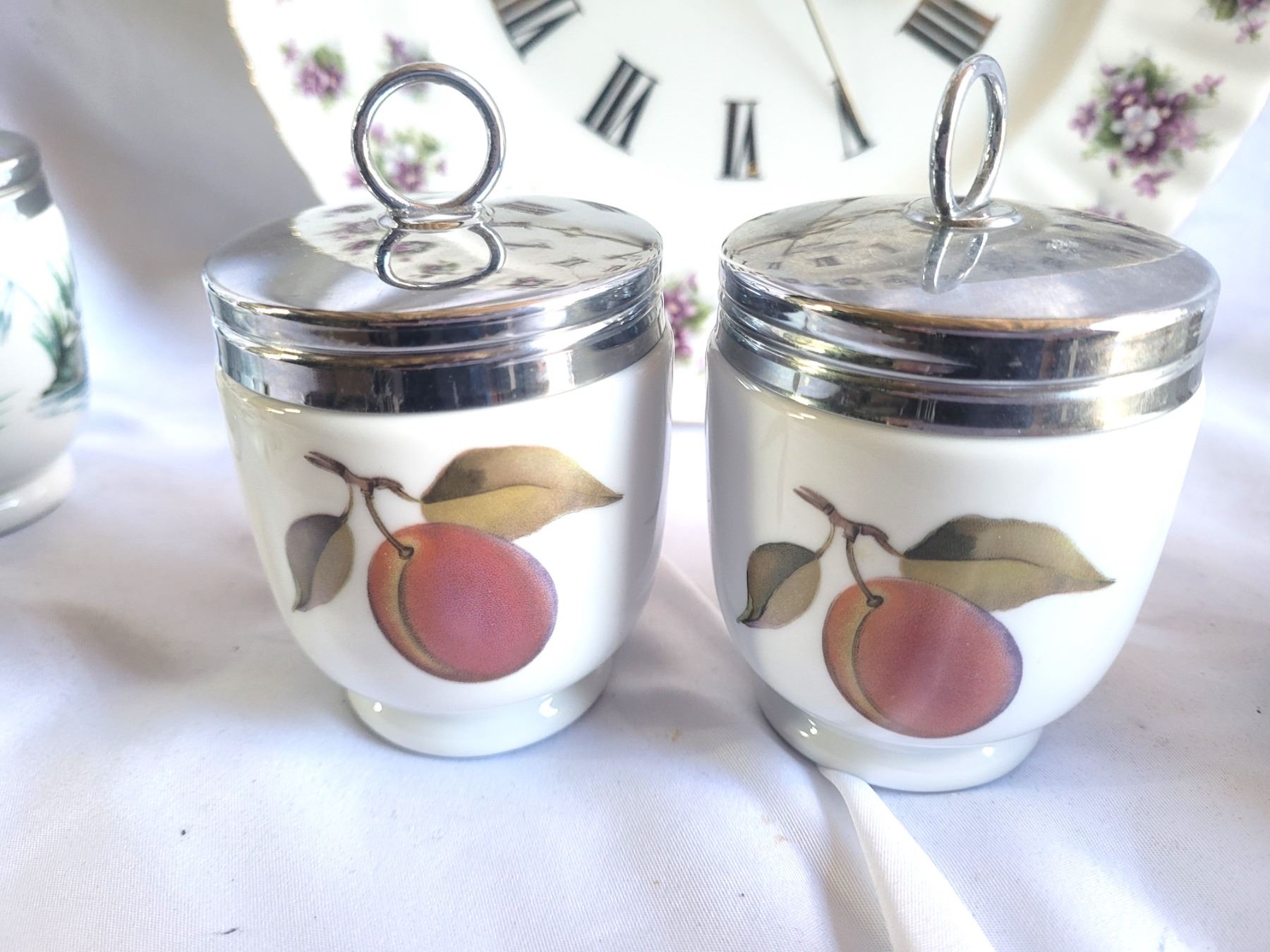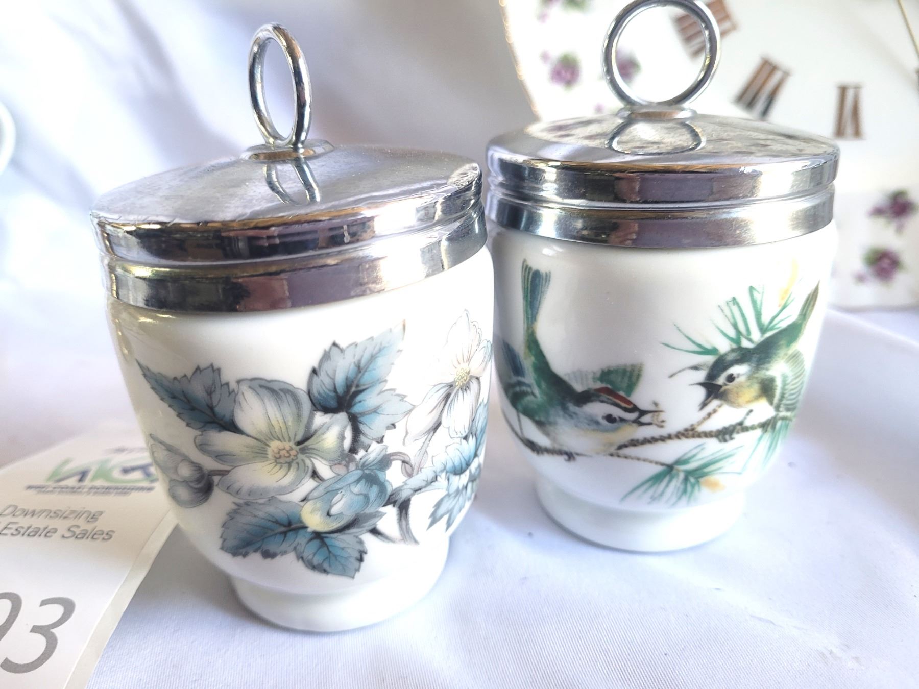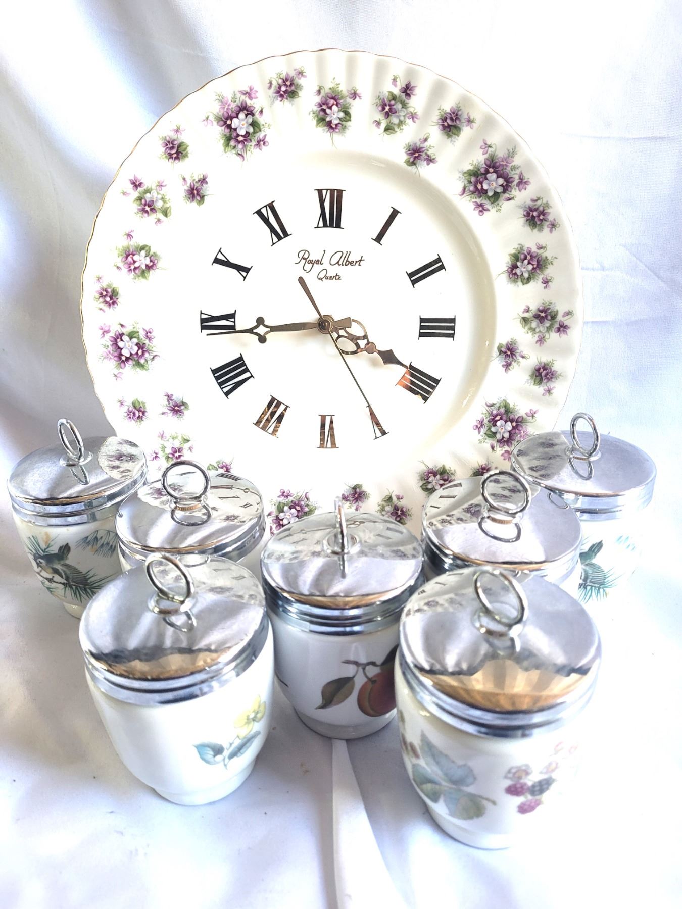 7 egg codlers and Royal Albert 'Sweet Violets' wall clock . Pickup at 9 am