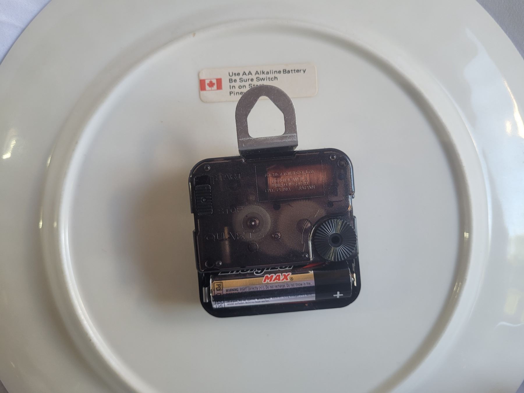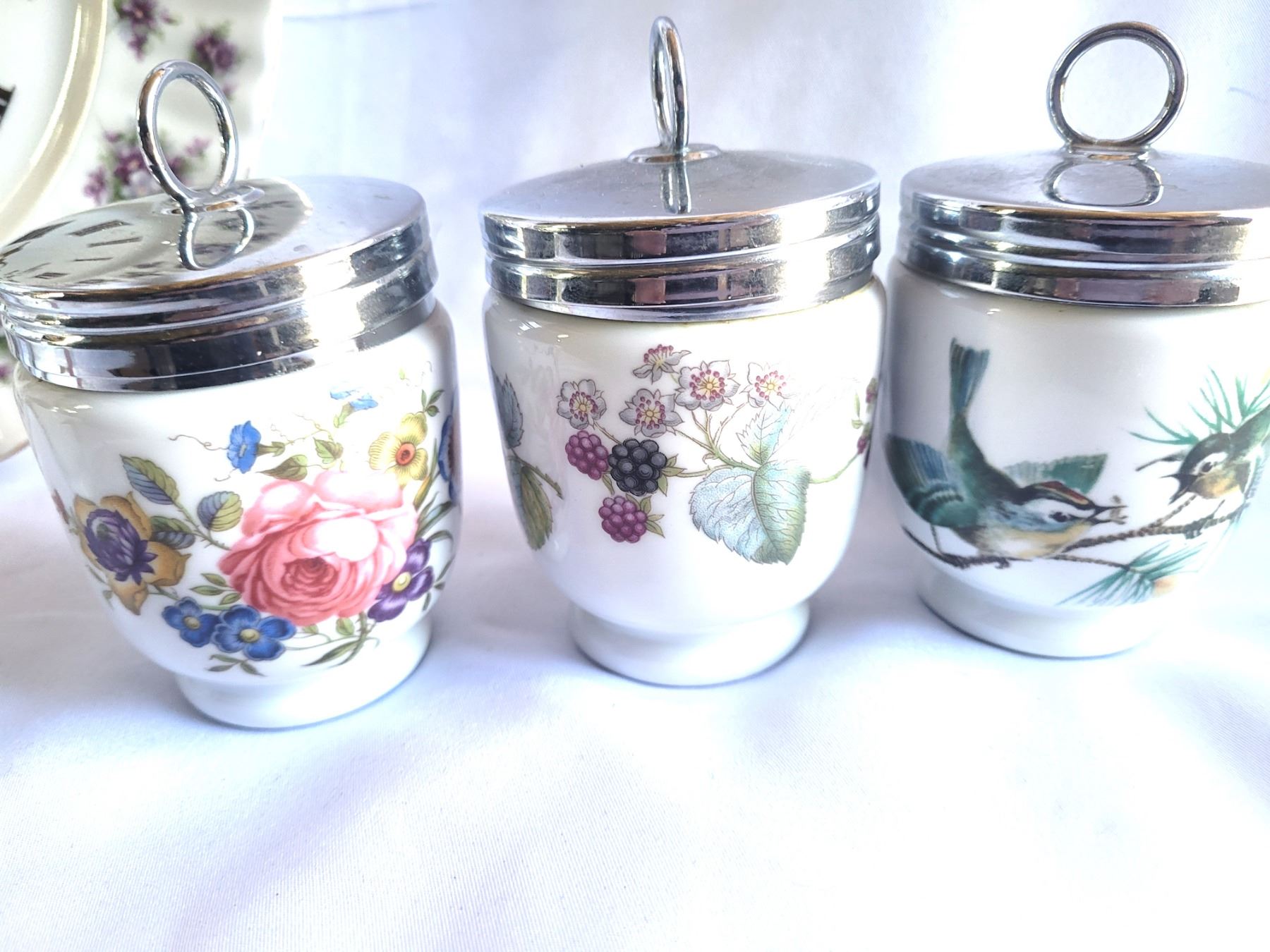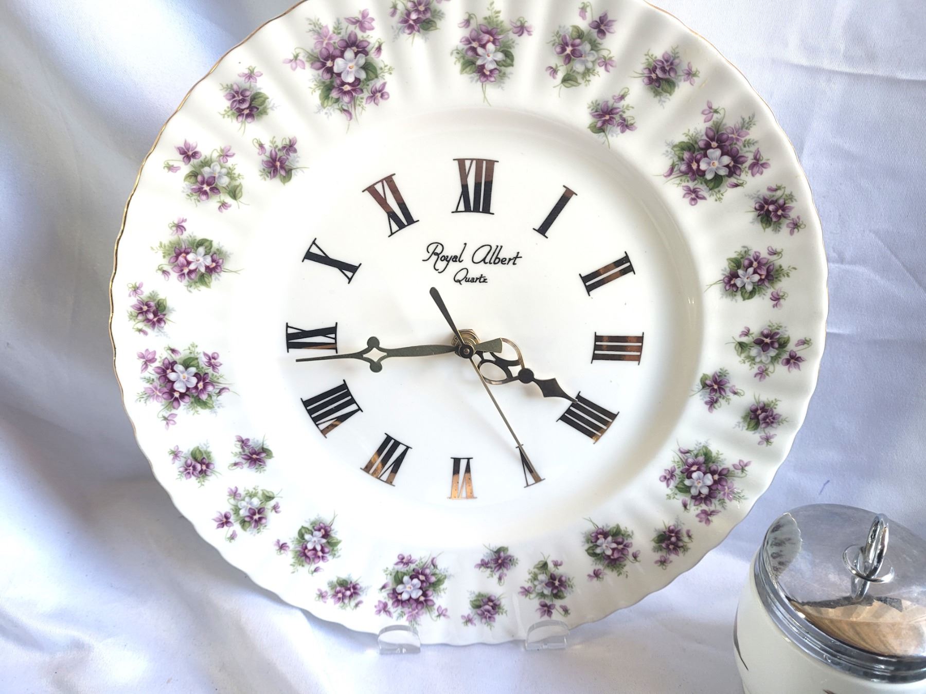 7 egg codlers and Royal Albert 'Sweet Violets' wall clock . Pickup at 9 am
