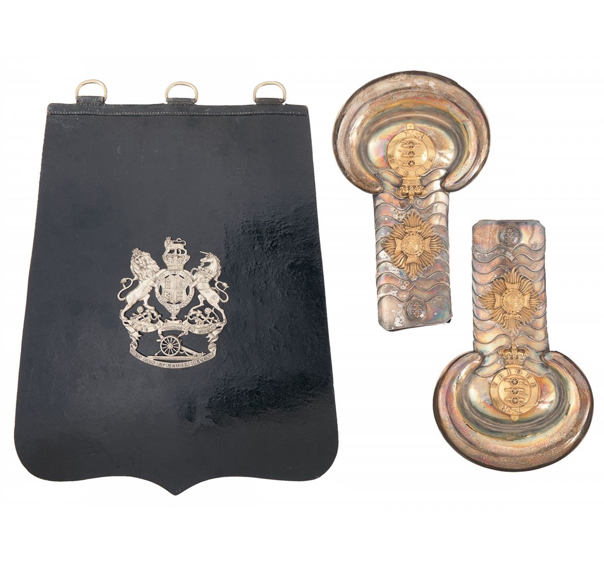 1) This is a Victorian era Royal Artillery Volunteer officer's undress sabretache. Composed of black patent leather with a silvered badge on the front with the Victorian crown above the Royal Arms of Great Britain with a cannon at the bottom. 2) Pair of Royal Artillery Militia shoulder scales. Composed of silvered scales with a silvered button having a crown over three cannons, a gilt badge having three King's crowns on a maltese cross on a star and a crown over a garter marked "UBIQUE" with three cannons in the center. The underside has black velvet and silvered brass attachment hardware. Consignor's notes state these are for a Major circa 1837.