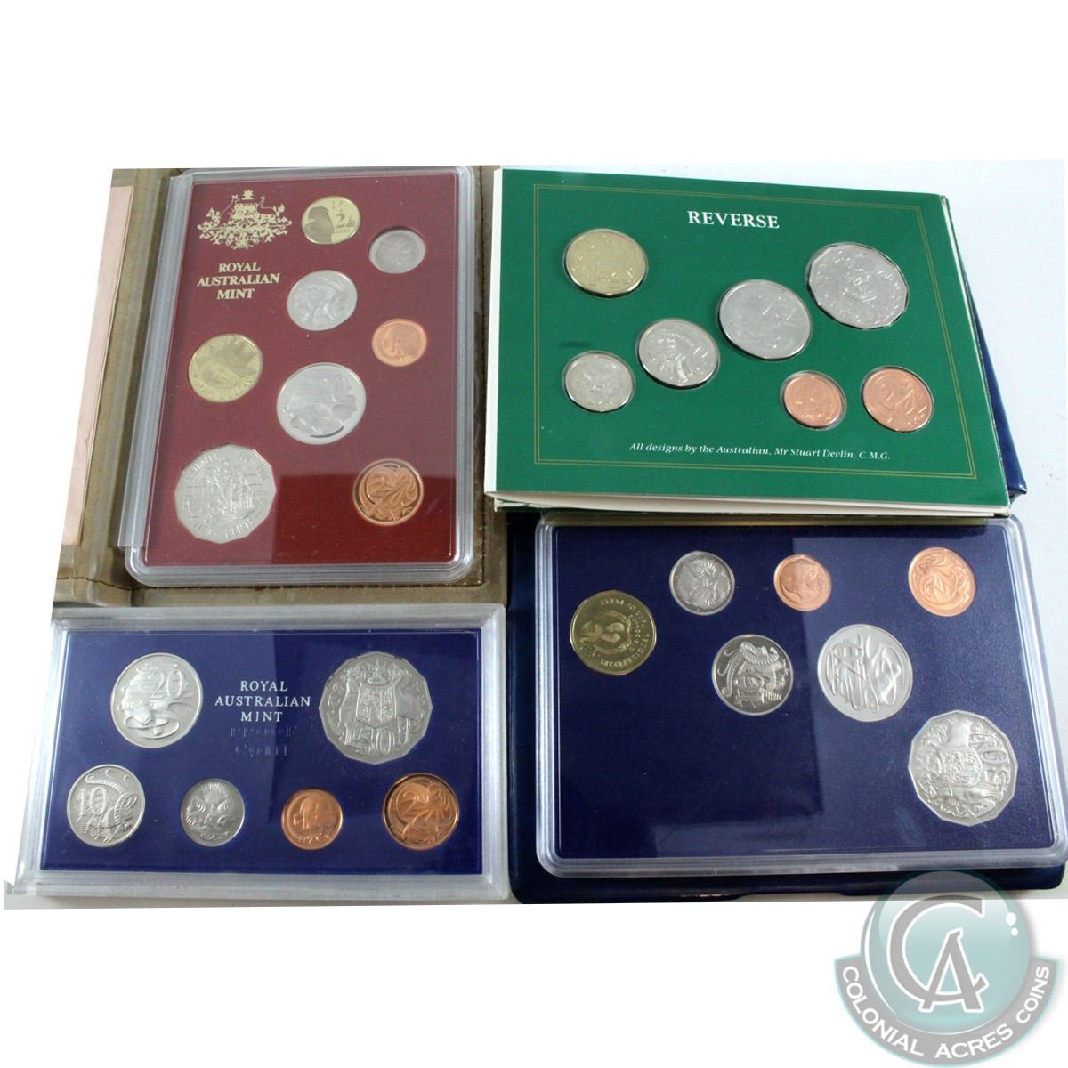 Royal Australian Mint: Lot of 4x Royal mint issued sets. This lot includes: 1980 Proof Set (Scuffed plastic), 1985 Uncirculated Set (Tattered sleeve), 1986 Mint Proof Set (Inner plastic scuffed) and the 1988 Proof Set (tattered outer box). (4 sets)