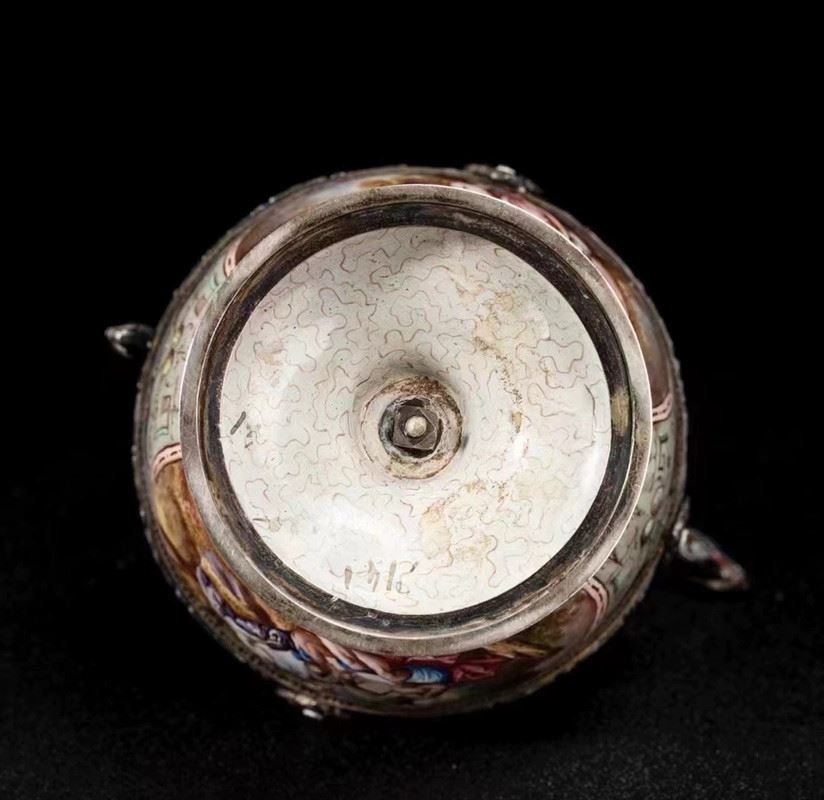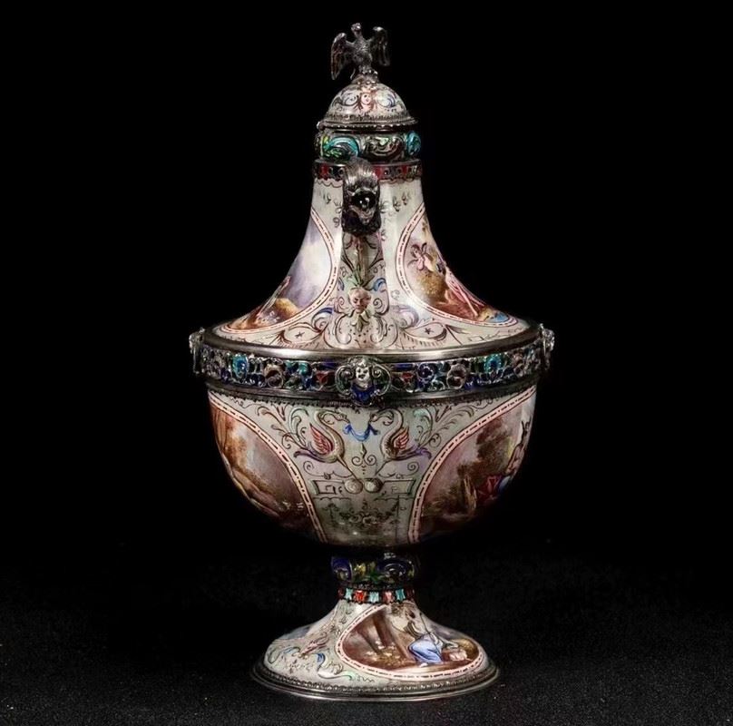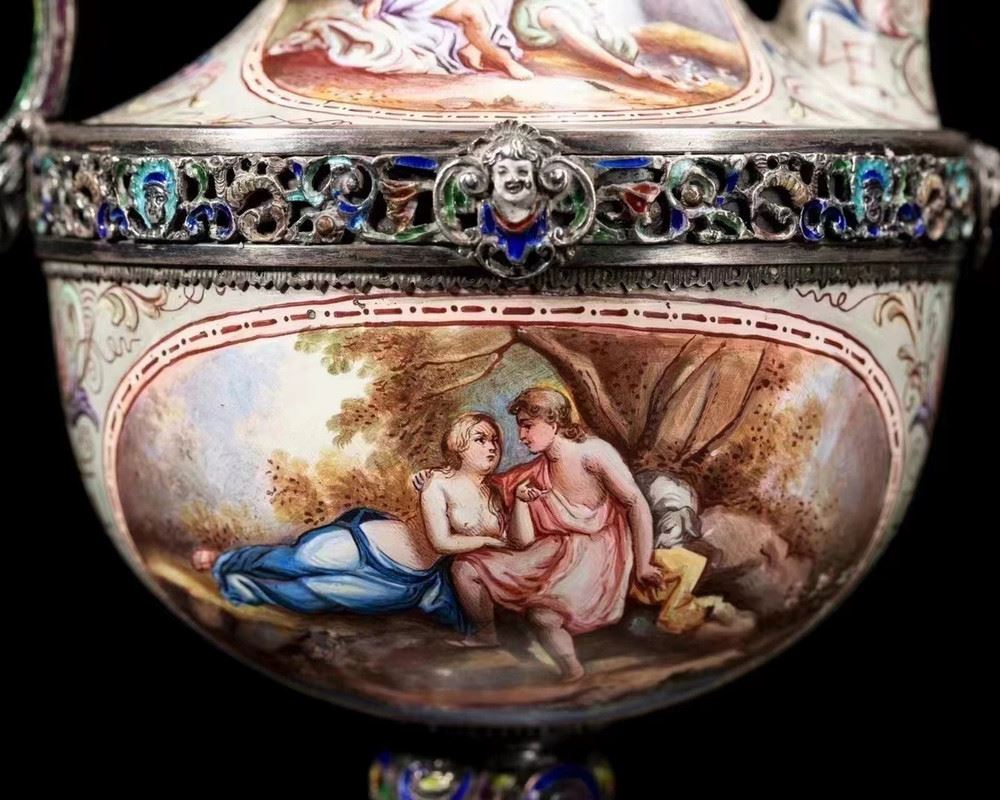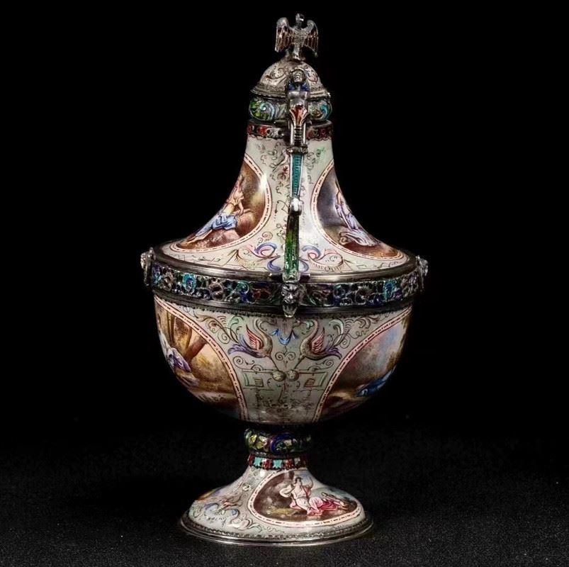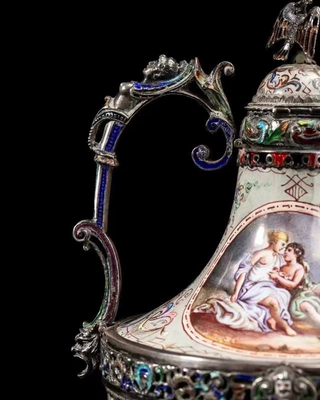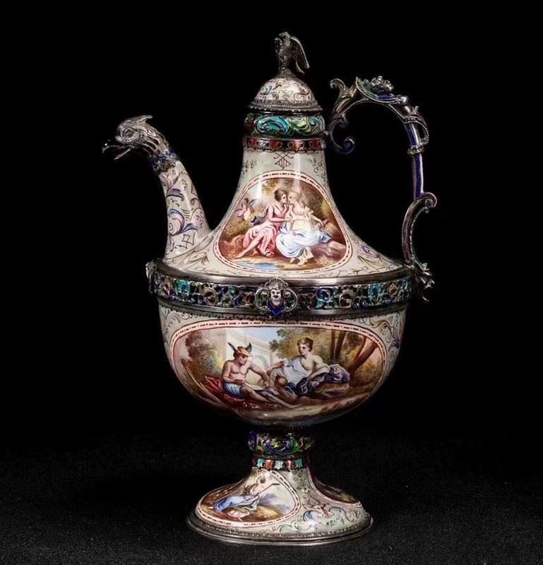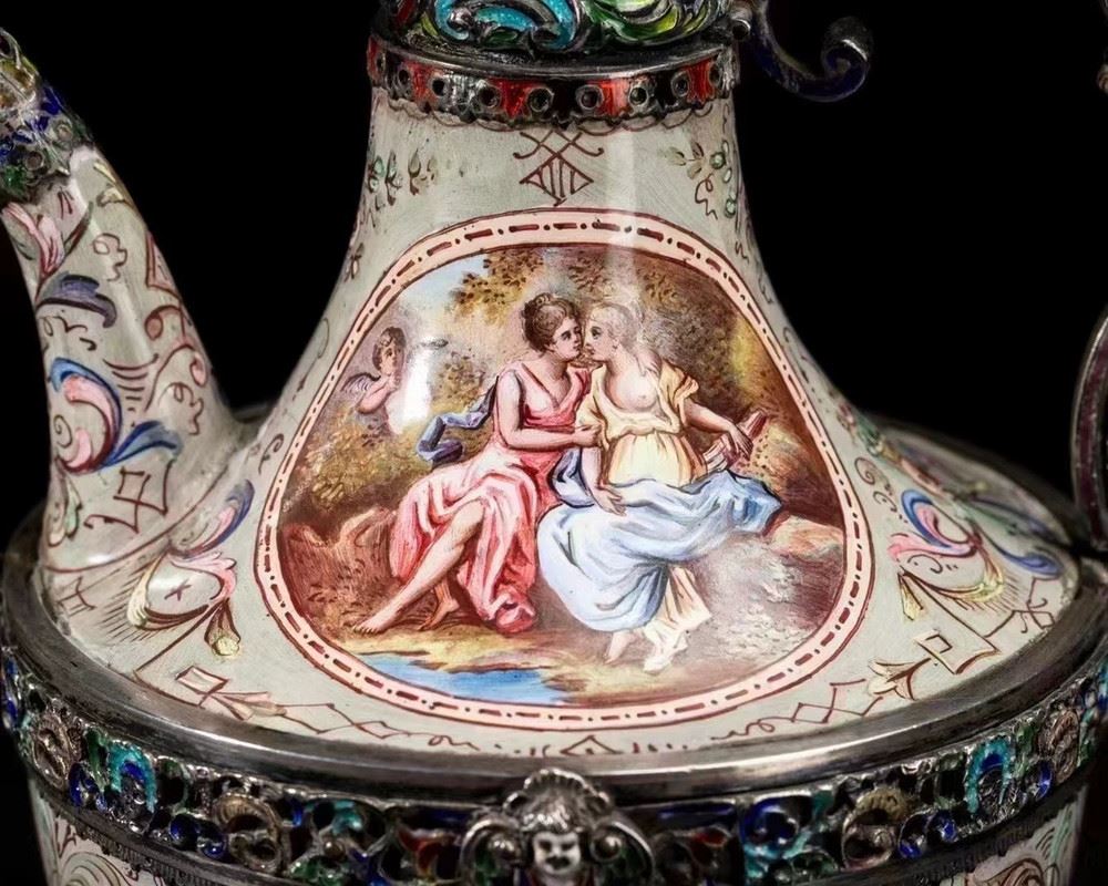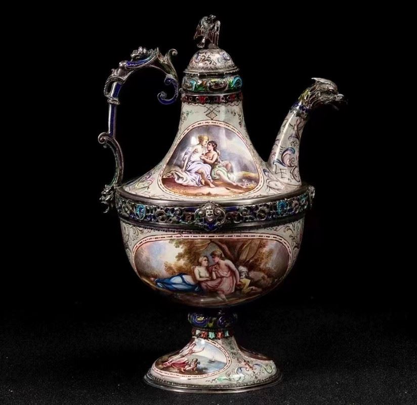 This Royal Austrian Vienna silver-based hand-painted enamel wine vessel exemplifies the perfect blend of elegance and luxury. The body of the wine vessel is crafted from fine silver, with a beautifully hand-painted enamel surface featuring vibrant classical scenes, with vivid colors and lifelike figures. The spout and handle are adorned with exquisite copper decorations, complementing the enamel artwork with harmonious beauty. The overall design is refined and grand, combining the Vienna court style with traditional European metalworking, making this piece a highly collectible treasure.
