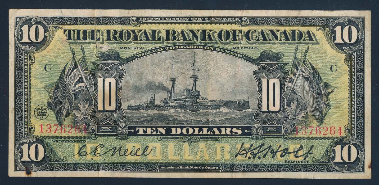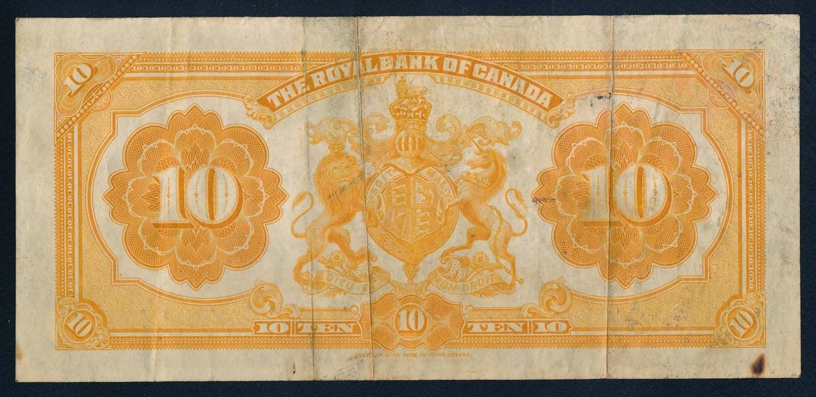Small internal tear below E of THE and R of Royal. Hard to see without holding the note to a light source. Ink stain below the bottom left 10. Edges intact.