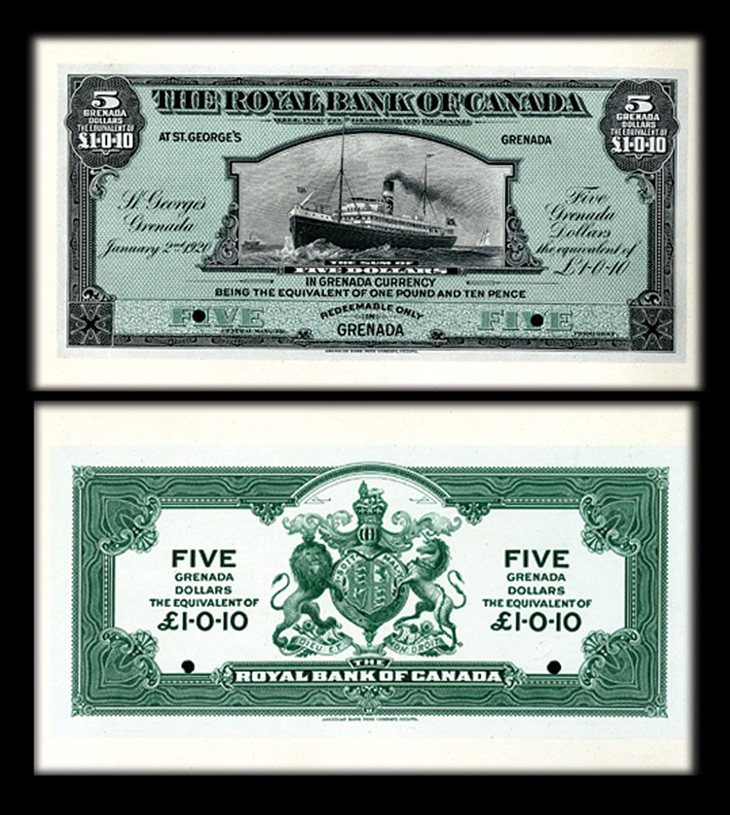 At St.George's, Grenada. 1920. $5 Grenada Dollars - 1 Pound and 10 Pence, P-S117p (6304802P), Proof face and back, Black on light green undertint, steamship in middle, back green with arms of the bank. Printed on india paper on large cards. "Redeemable only in Grenada". POC's. Both face and back PMG graded Gem Uncirculated 66 EPQ, Rare note in any form or condition and the only one listed in the PMG census. ABNC.