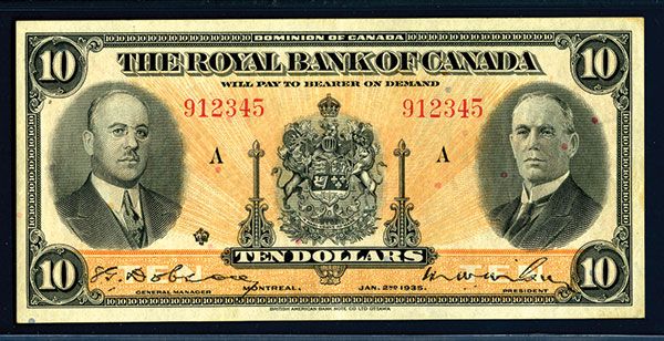 Montreal, Quebec, Canada, 1935, $10, P-S1392, (6301804a), Issued banknote, black on light orange underprint, Canadian Arms at center, S/N 106736, PMG graded Choice About Uncirculated 58 NET with note of very lightly previously mounted, attractive banknote with large margins, sharp corners and bright fresh appearance with an extremely light vertical fold keeping this attractive note from Uncirculated, ABNC, Ottawa.