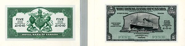 Port of Spain, Trinidad. 1938. $5 Trinidad Dollars = 1 pound/10 Shillings. P-S151 (6306802P), Unlisted face and back Proofs with large margins. Both are PMG graded Gem Uncirculated 66 EPQ, Steamship at center on light blue undertint, back green with arms. ABNC. Rare note in any form and very possibly the finest known for this issue.