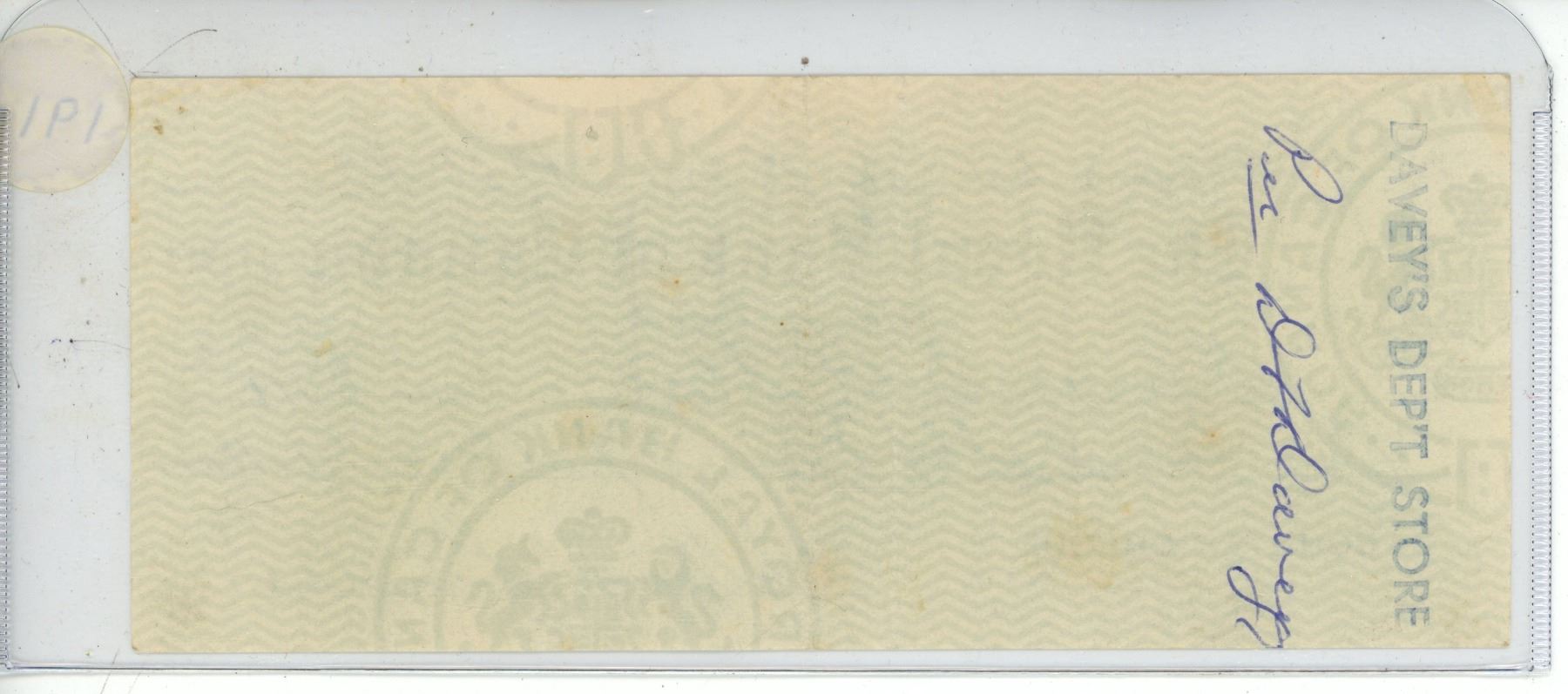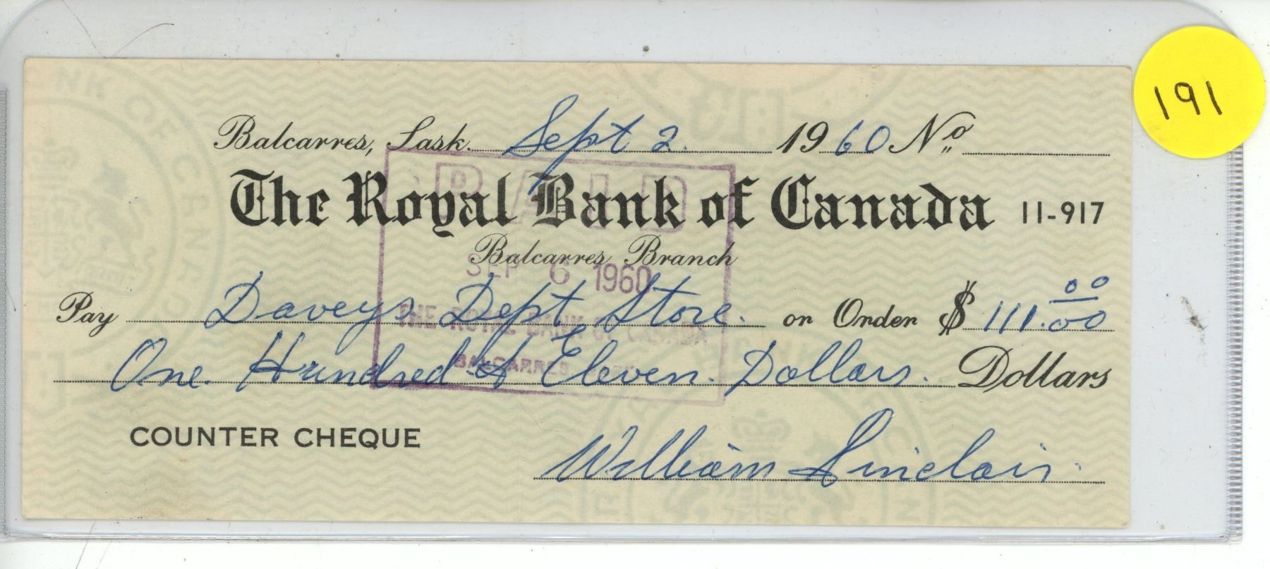 Royal Bank of Canada cancelled cheque from Balcarres, Sask. dated 1960 for $111.00.