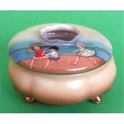 Produced by Royal Bayreuth during the early 20th century, in their Beach Babies, AKA Sand Babies, motif. This beautiful hair receiver features a beach scene resplendent with three young children frolicking in the sand by the ocean. Measures 2 1/4 inches tall x 4 inches in diameter, stands on three gold feet and is in excellent condition.