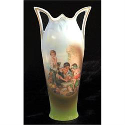 This exquisite Art Nouveau vase was produced by Royal Bayreuth during the early 1900s. Featuring a detailed hand painted tableau of three youths engaged in a game of dice against a pastel blue sky. Measuring 7 inches tall x 3 3/4 inches across the handles - With only slight wear to the gold trim, due to age, the vase is in excellent condition without any damage or crazing.