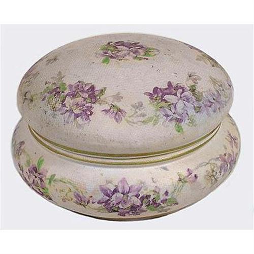 Royal Bayreuth Tapestry China is so named because of its rough finish similar in texture to needlepoint tapestry. This effect was obtained by the process of wrapping the article in coarse cloth, then baking. The cloth was consumed in the baking and the desired tapestry effect resulted. The beautiful floral decoration was added over the glaze. Measuring 3 1/2? x 2 1/2? tall with both the lid and jar in excellent condition