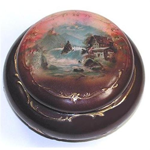 Produced by Royal Bayreuth, c 1900, and bear a brown stamp. This footed chocolate porcelain powder jar features a lid with a landscape scene of a colorful Castle, Mountain and Waterfal. The choclate colored jar is liberally decorated with gold trim. Measures 2 1/2 inches tall x approximately 4 inches in diameter - in excellent condition without damage or crazing.