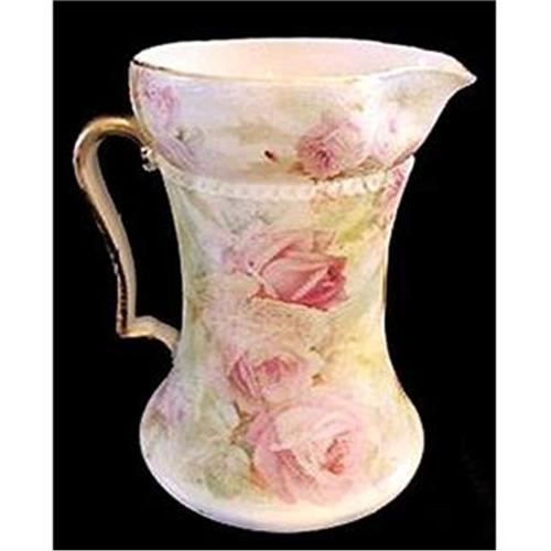 This Corset pitcher was produced by Royal Bayreuth in their desirable three color rose pattern, pink, white and yellow. Featuring an Art Nouveau overall design, tankard shape, ornate gold handle - pink, white and yellow roses everywhere. The rim is trimed in gold with only slight wear. Measuring 4 3/4 inches tall x 3 1/2 inches in diameter. The Corset pitcher bears the blue Royal Bayreuth mark and is in excellent condition. This pitcher is shown in McCaslin: Royal Bayreuth A Collector's Guide as item number 1131. Royal Bayreuth Tapestry China is so named because of its rough finish similar in texture to needlepoint tapestry. The process of wrapping the article in coarse cloth, then baking, obtained this effect. The cloth was consumed in the baking and the desired tapestry effect resulted. The floral decoration was added over the glaze. These pieces were produced at the Royal Bayreuth Porcelain factory in Tettau, Germany during early 1900s