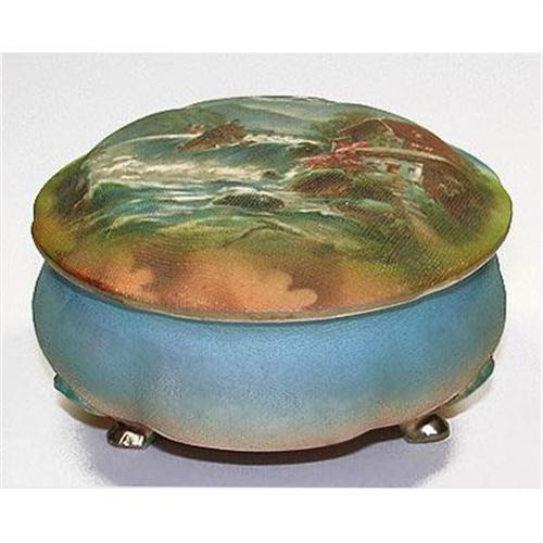 Royal Bayreuth Tapestry China is so named because of its rough finish similar in texture to needlepoint tapestry. The process of wrapping the article in coarse cloth, then baking, obtained this effect. The cloth was consumed in the baking and the desired tapestry effect resulted. The lid depicts a colorful Castle, Mountain and Waterfall scene with a pale blue base that stands on three gold feet. Measures 4 1/2 inches in diameter x 2 1/2 inches tall with both jar and lid in excellent condition, no chips, repairs, cracks or crazing ? A truly exquisite and very rare piece of Royal Bayreuth tapestry porcelain.