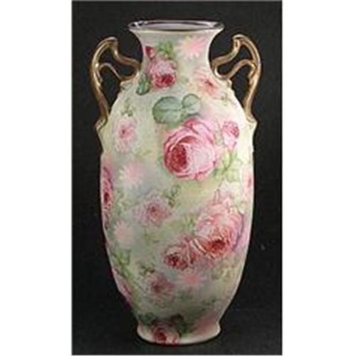 Royal Bayreuth Tapestry China is so named because of its rough finish similar in texture to needlepoint tapestry. This effect was obtained by the process of wrapping the article in coarse cloth, then baking. The cloth was consumed in the baking and the desired tapestry effect resulted. The beautiful Pink Roses pattern with floral decoration, was added over the glaze. The bottom has the Royal Bayreuth blue stamp dating it back to the early years off the 20th century. This outstanding 9 1/2 inch tall vase features ornate gold painted handles, dozens of pink roses, all against their rich Tapestry background. With the exception of only slight wear to the gold, this vase, is in excellent condition without any damage, or crazing, etc