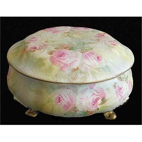 Royal Bayreuth Tapestry China is so named because of its rough finish similar in texture to needlepoint tapestry. This effect was obtained by the process of wrapping the article in coarse cloth, then baking. The cloth was consumed in the baking and the desired tapestry effect resulted. The beautiful floral decoration was added over the glaze. Measuring 4 inches x 2 1/2 inches tall with both the lid and jar in excellent condition without any damage or crazing