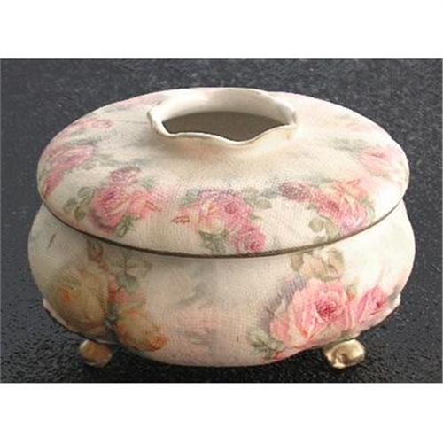 </font></strong>Royal Bayreuth Tapestry China is so named because of its rough finish similar in texture to needlepoint tapestry. The process of wrapping the article in coarse cloth, then baking, obtained this effect. The cloth was consumed in the baking and the desired tapestry effect resulted. The surrounds of pink roses, floral decoration and green flora background was added over the glaze. The 3 gold footed hair receiver measures 4 1/2 inches across x 3 inches tall and, with only minor wear to the gold, is in excellent condition without any damage or crazing.</font>