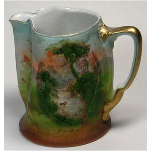 Produced by Royal Bayreuth Tapestry China in their Tettau, Germany factory during early 1900s and marked underneath with their early 20th century blue mark. Named because of its rough finish similar in texture to needlepoint tapestry. The process of wrapping the article in coarse cloth, then baking, obtained this effect. The cloth was consumed in the baking and the desired tapestry effect resulted. The beautiful scenic decoration was added over the glaze. This scenic Royal Bayreuth Tapestry creamer or pitcher is decorated with a stag in a stream, a gazebo on a hill, all surrounded by a forest. Measuring 3 1/4 inches tall x 4 inches wide from spout to handle with a pinched spout. The tapestry is excellent, the colors are vibrant and the gold is intact on the handle. With only minimum wear to the gold on the rim and spout this Royal Bayreuth scenic tapestry creamer or pitcher is in excellent condition.