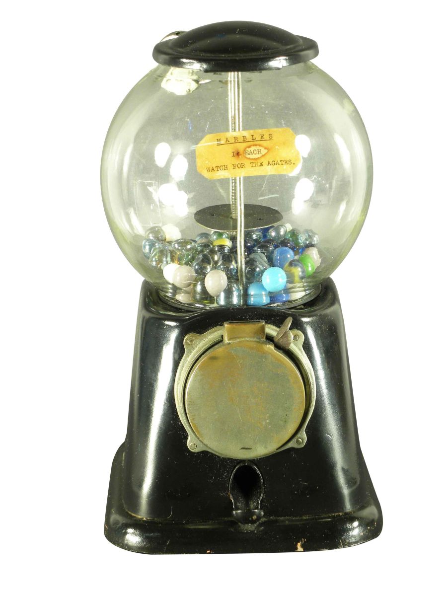 Royal Bell Vendor with rare bicycle bell mechanism. Coin-operated one cent. Converted to marble dispenser. Good original condition, comes with lock/keys. 13 inches tall.