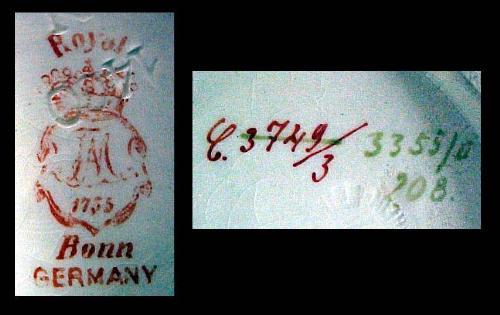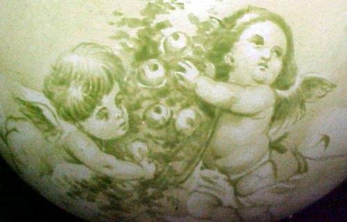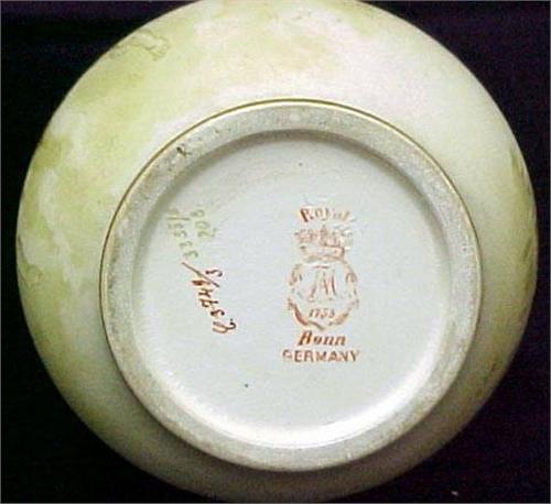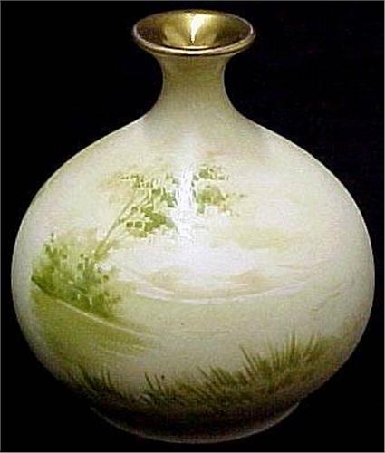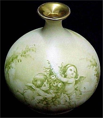 Royal Bonn bud vase; pear form with hand painted cherub decoration on front and scenic decoration on back; interior gilding on lip; marked on bottom and numbered; second half of 18th C. (see Handbook of Old Pottery and porcelain Marks by C. Jordan Thorn) measures 5 1/4" high x 5" diameter