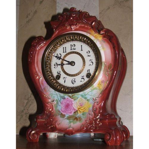 Royal Bonne, "La Plaine" Early 20th century. Porcelain. Nice dark magenta clock with pink and yellow rose decorations under the solid white porcelain dial. Broken Chime Spring