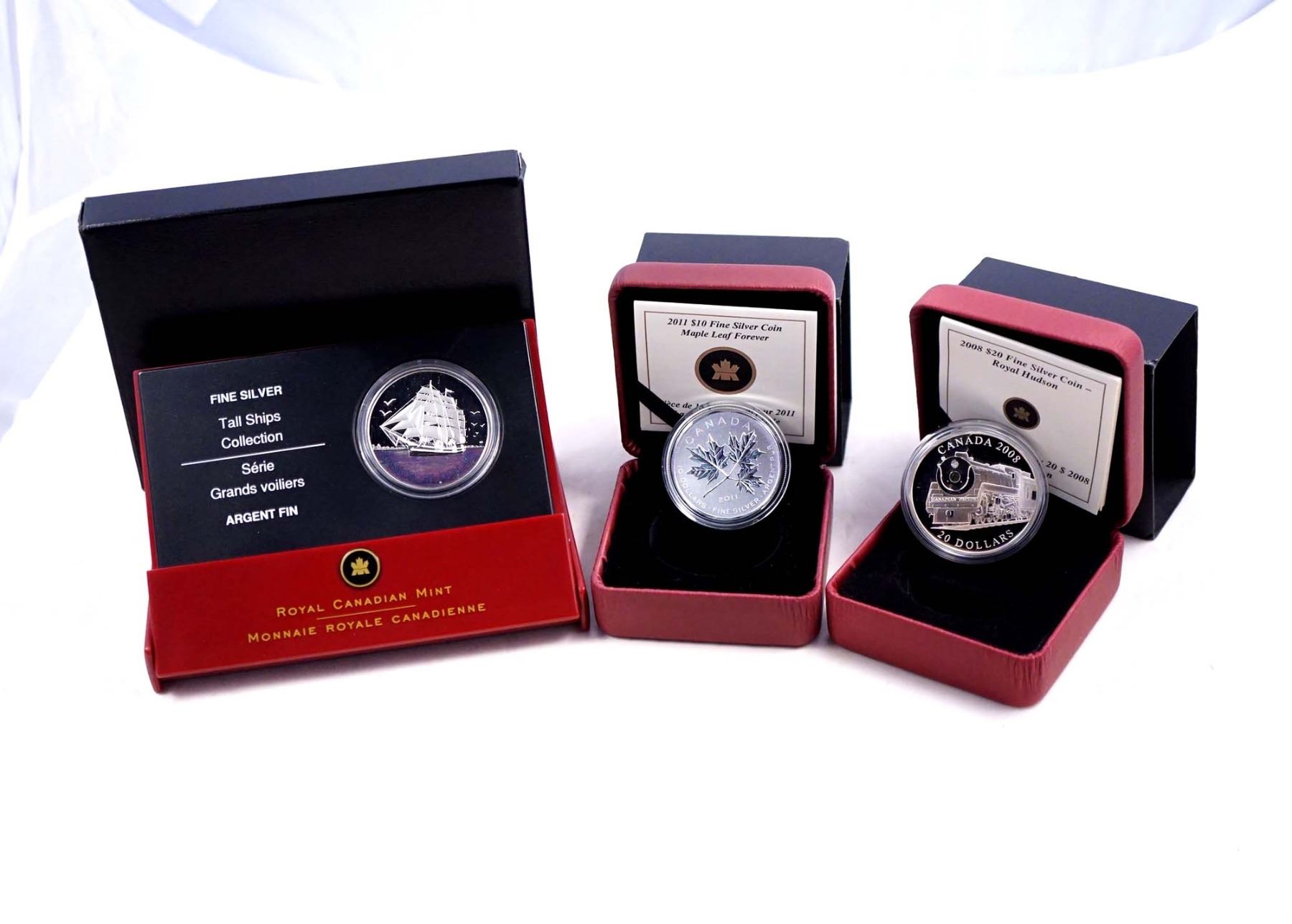 1 x 2005 $20.00 Tall Ship w/box, sleeve & COA, 1 x $20.00 Royal Hudson train w/COA, box sleeve and 1 x 2011 $10.00 Maple Leaf Forever w/COA, box, sleeve.