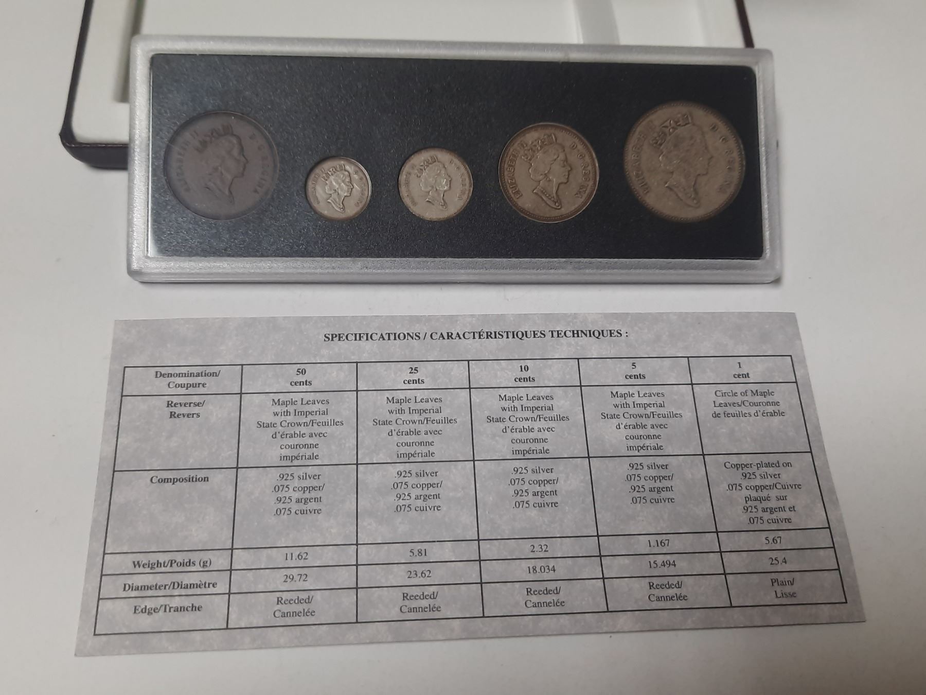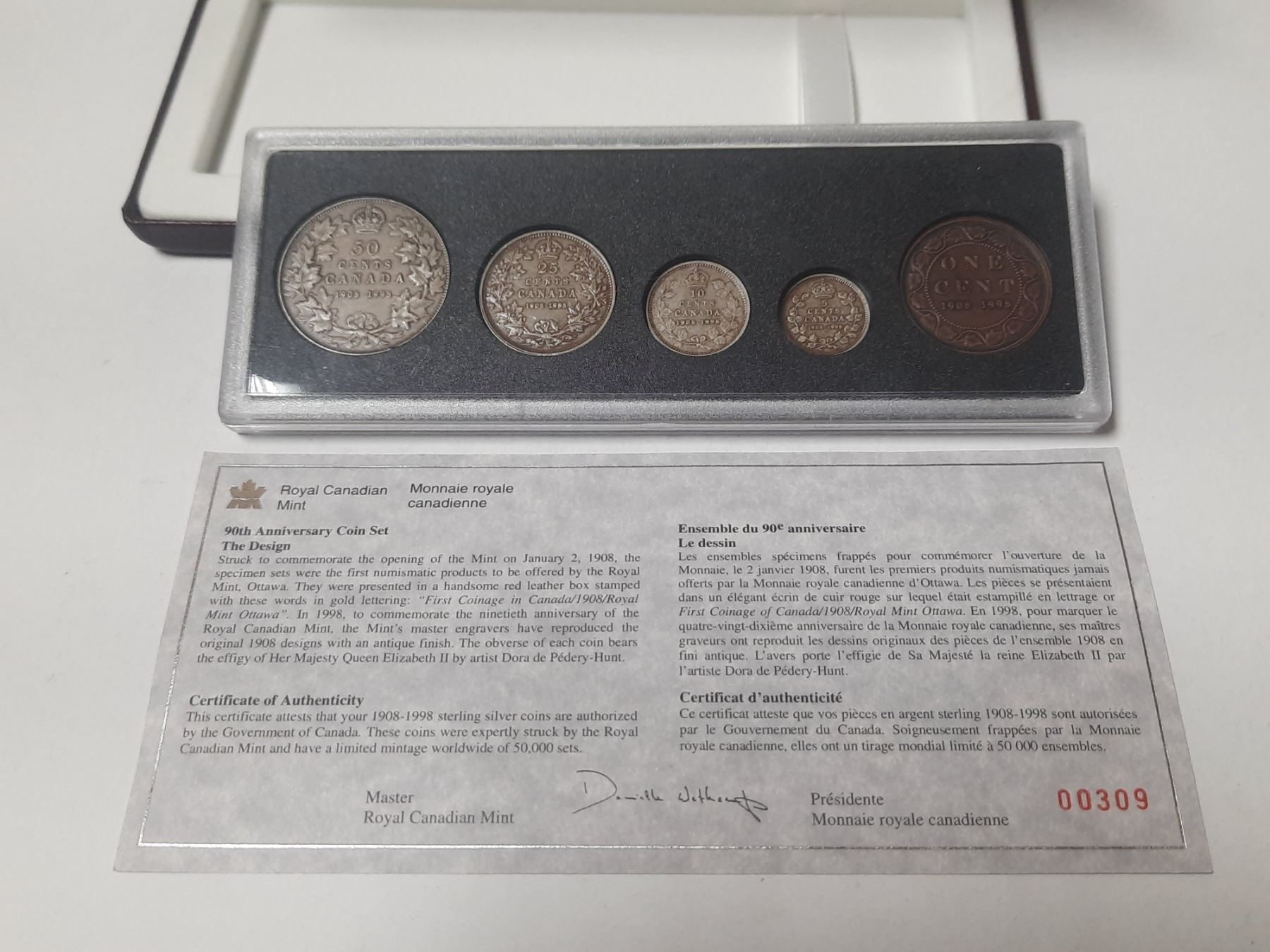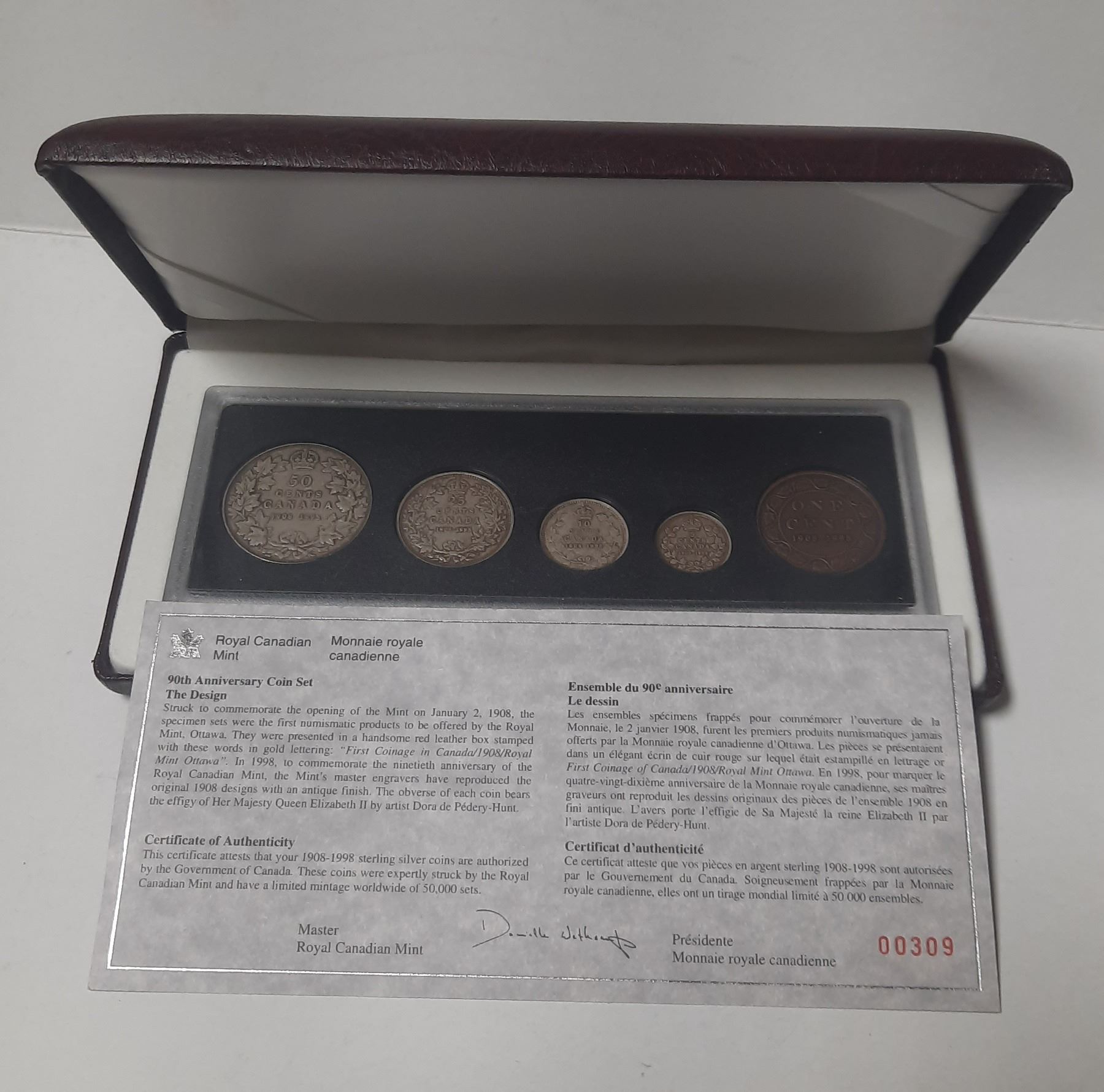 Royal Canadian Mint 90th Anniversary Coin Set 1908-1998 Sterling Silver Coins with antique finish. Certificate of Authenticity included.