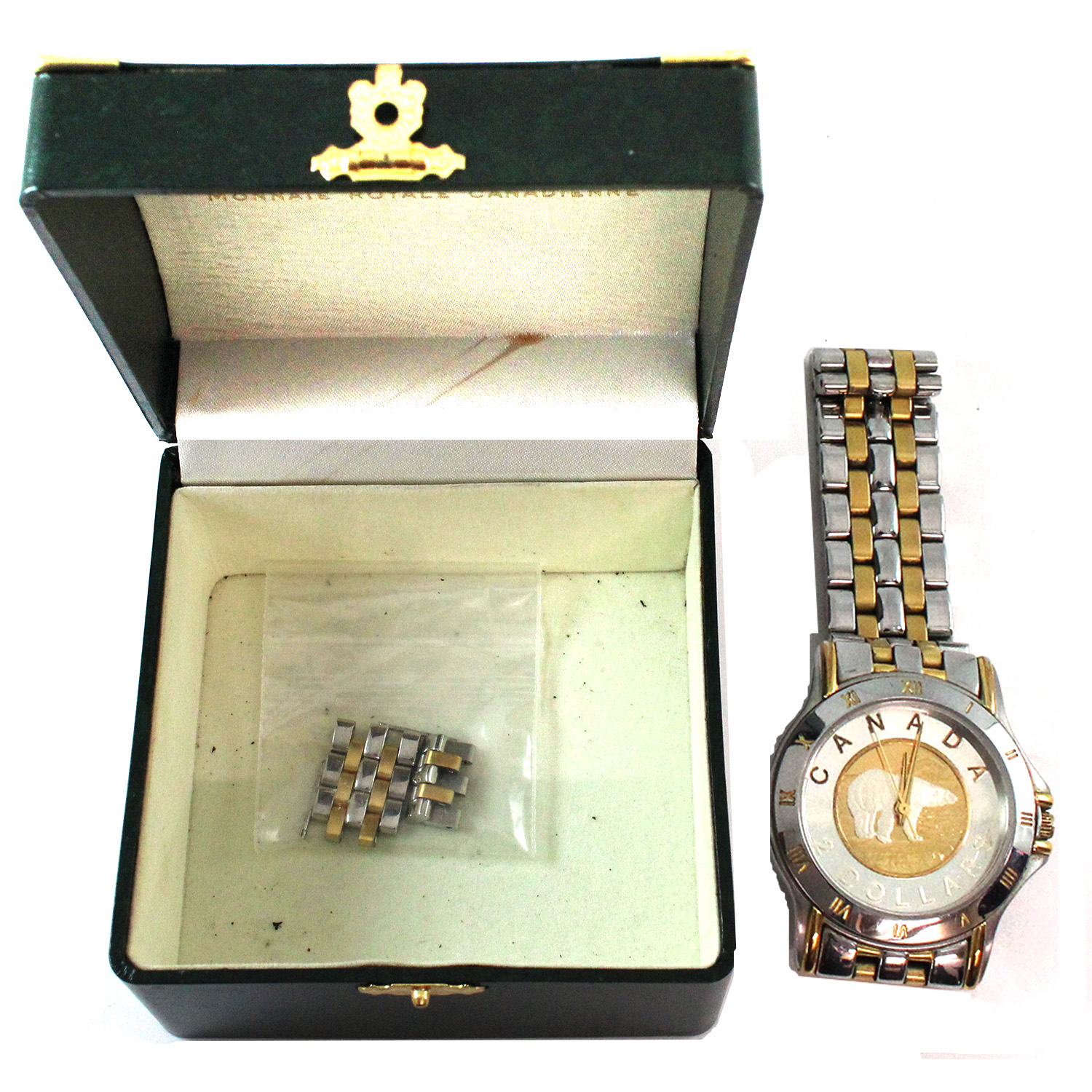 Includes the limited two-year guarantee slip and 5 extra links. Light scratches on band and face/crystal of watch from use