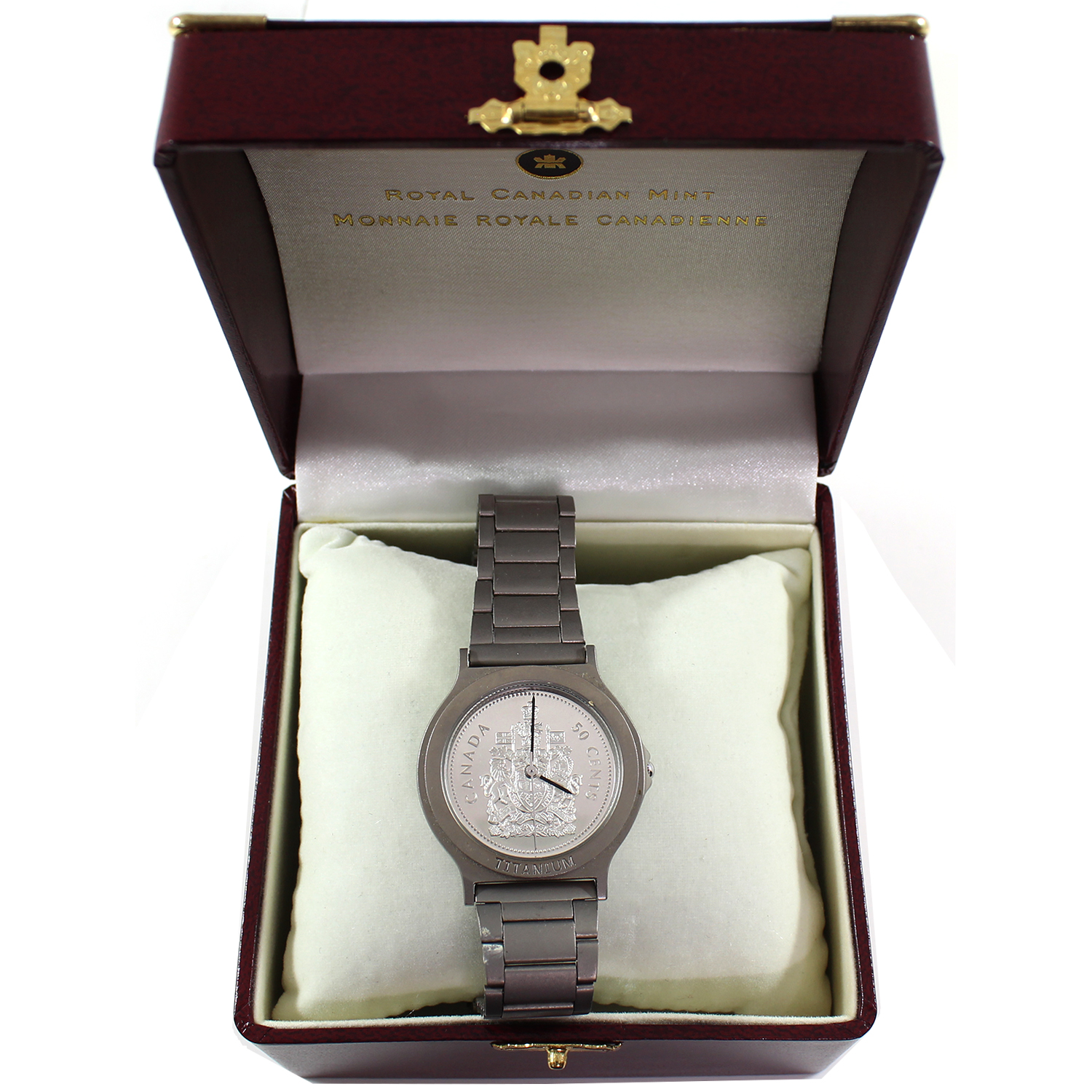 The face of the watch is a sterling silver 50-cent coin, while the case and bracelet are made of titanium. Comes in a beautiful burgundy RCM box. New batteries will need to be installed, sold as is.