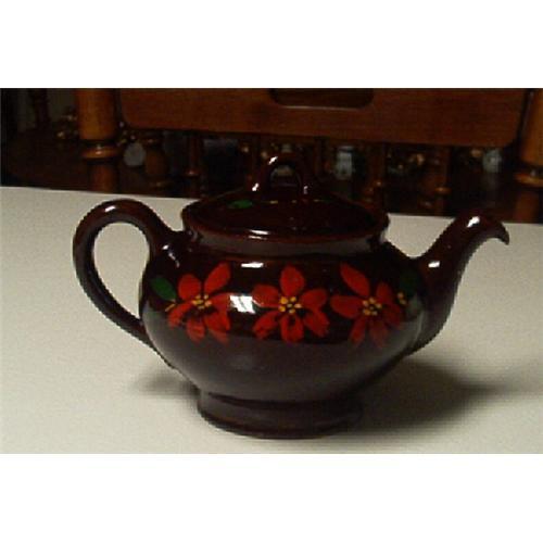 This is a very pretty, decorative pottery, teapot, made by Royal Canadian. Embossed on the bottom: ROYAL CANADAIN-ART POTTERY-HAMITON-CANADA-ROYAL-DRIPLESS. Highly glazed, brown/black background with hand painted red flowers with green leaves along with yellow dots in the center of the flowers. The lid still has some partial red flowers and green leaves also. This teapot measures 5 inches tall, including handle and pour spout the width measures approximately 10 inches; opening diameter measures 3 1/2 inches; base diameter measures 3 3/4 inches. I will mention that the underside of the lip of the lid does have two separate niplets, but, does not show or distract from the teapot when the lid is closed. An excellent teapot to put on a shelf to decorated or to add to your teapot collection.