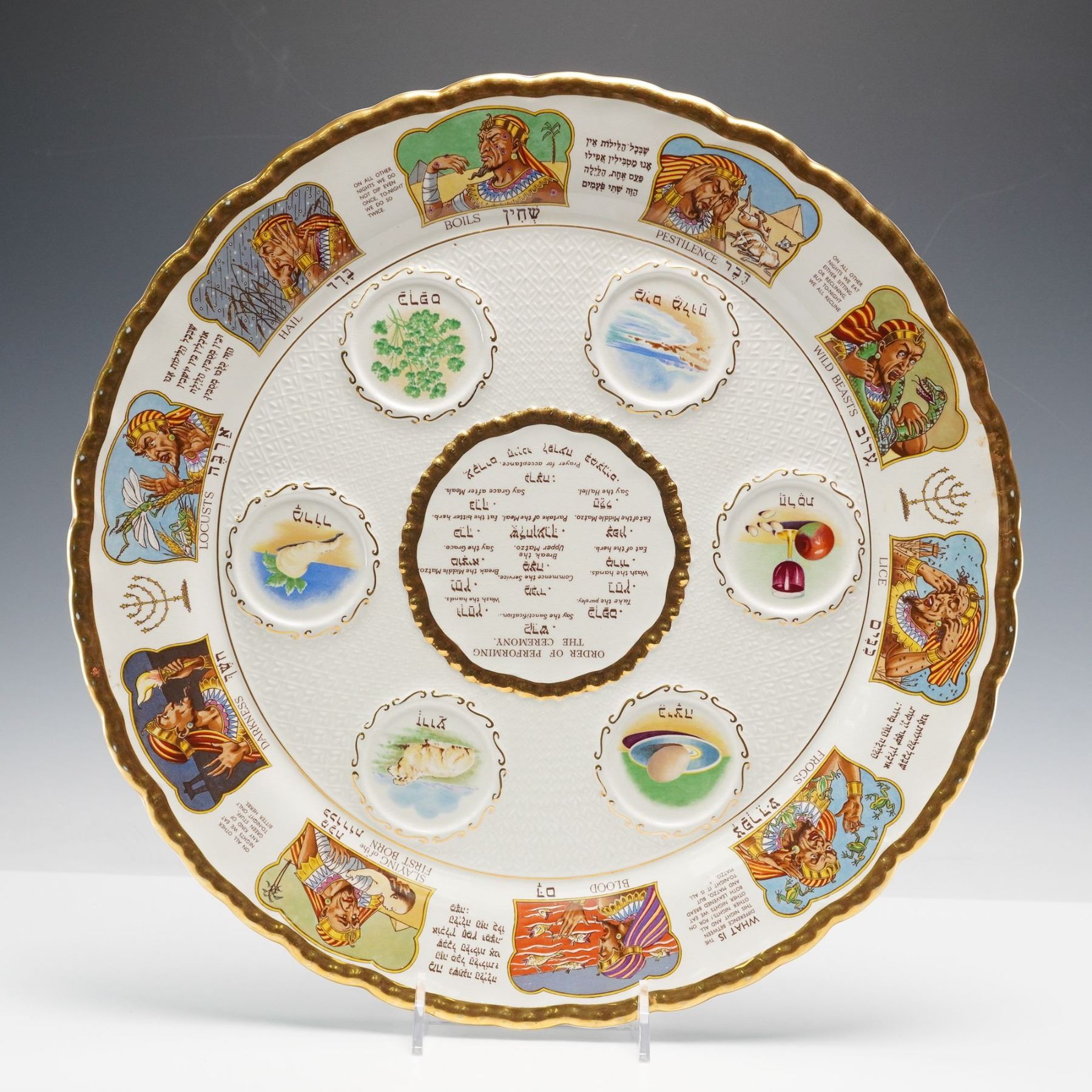 A ceramic Seder plate manufactured by Royal Cauldon, England. The reverse bears the printed mark Made in England, Royal Cauldon 'Seder Dish,' within a blue Star of David design decorated with vines, grapes, and pomegranates. The obverse features a central medallion inscribed "Order of Performing the Ceremony" in English and Hebrew, surrounded by six recessed wells labeled for traditional Seder foods. Around the border are polychrome scenes illustrating the Ten Plagues with accompanying Hebrew text. The rim is scalloped and trimmed in gilt.