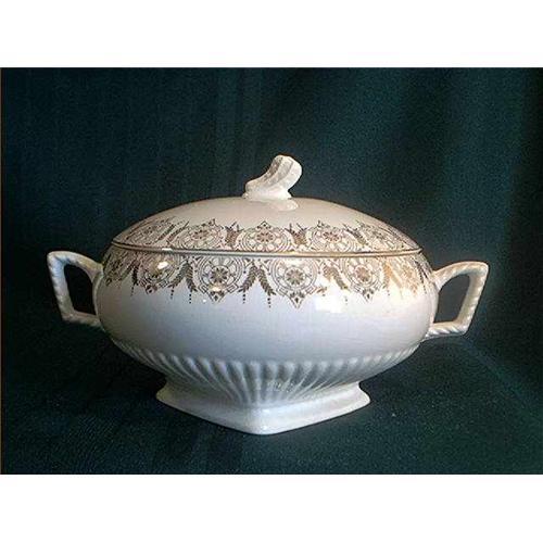 Serving Bowl by Royal China Inc. has lid and is off white color with brown gold design around the rim of the bowl and the lid and is on a diamond shaped base with crackle glaze on inside. This pretty covered serving bowl is marked "National Brotherhood or Operative Potters inside the Seal" and is marked "Royal China Inc., Sporing, Ohio". Measures 6 inches high and 10.5 inches wide and is in good condition with no chips or cracks.