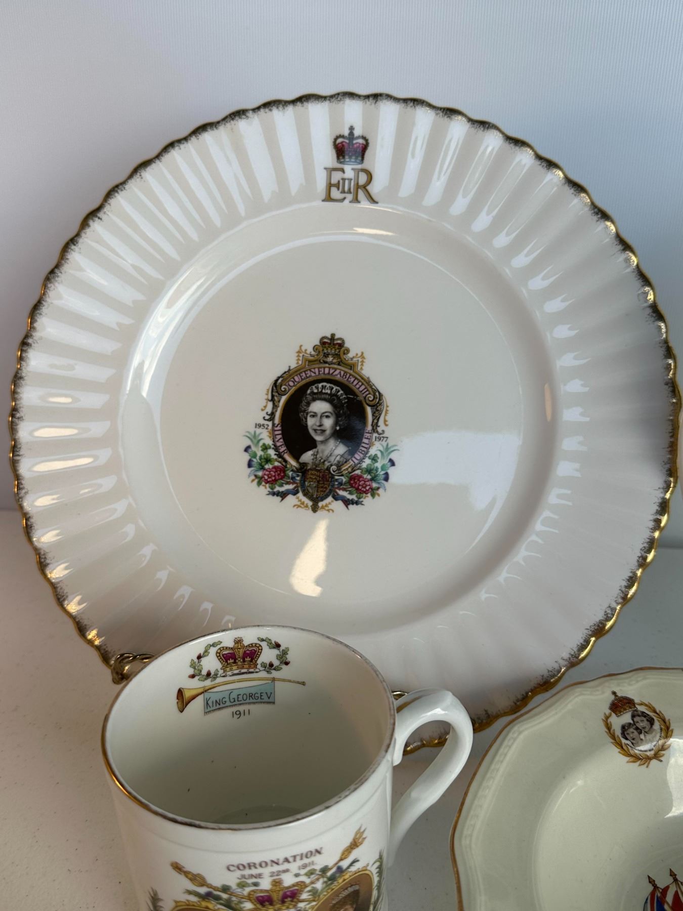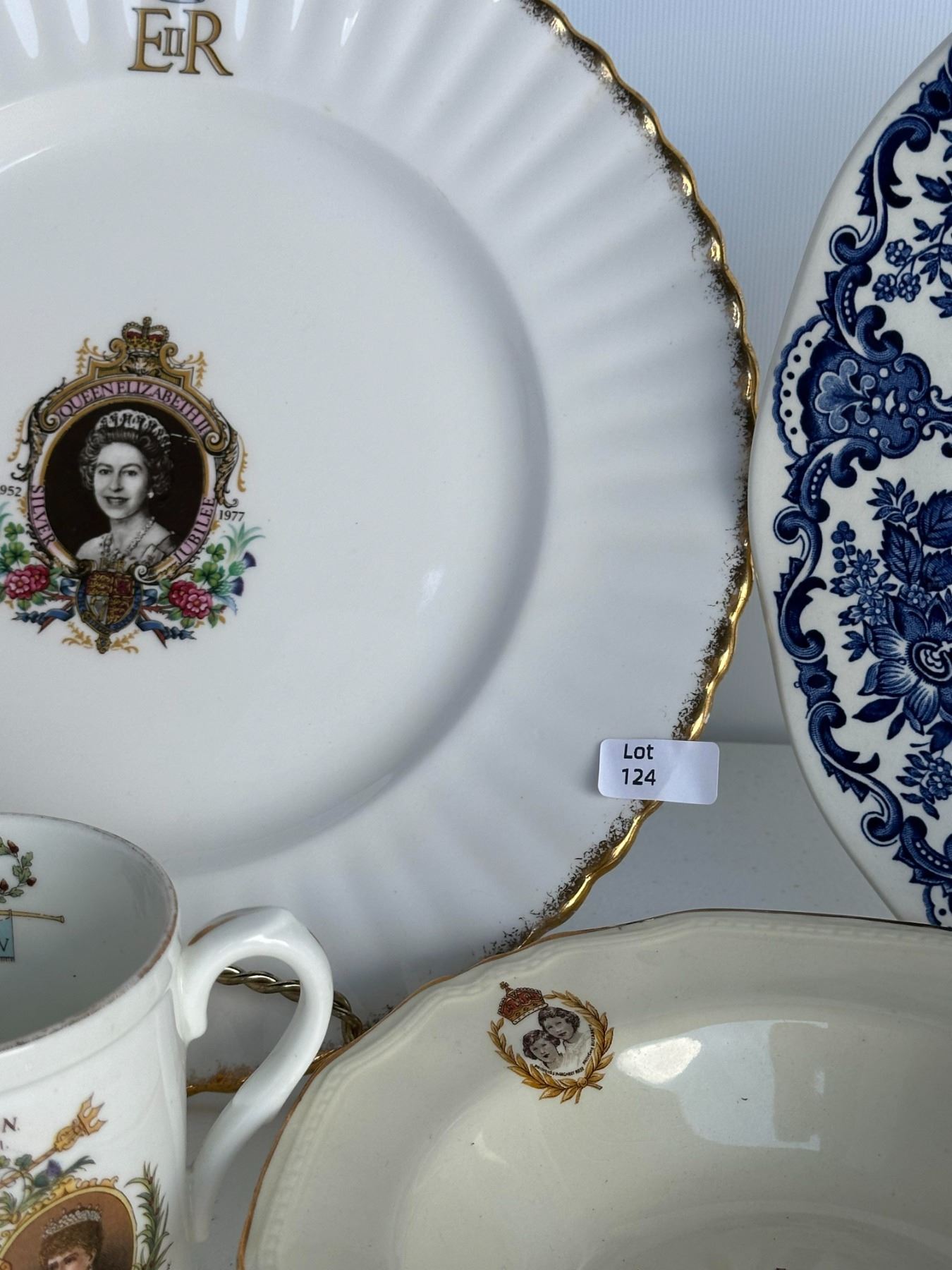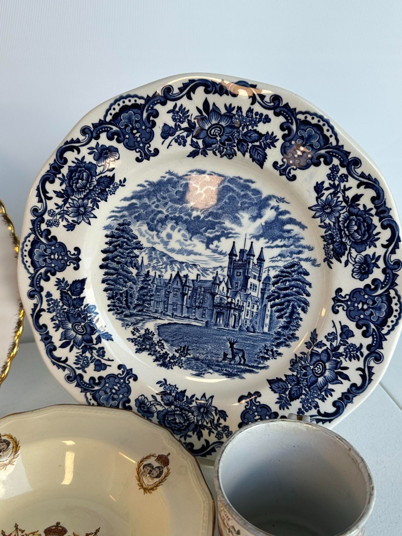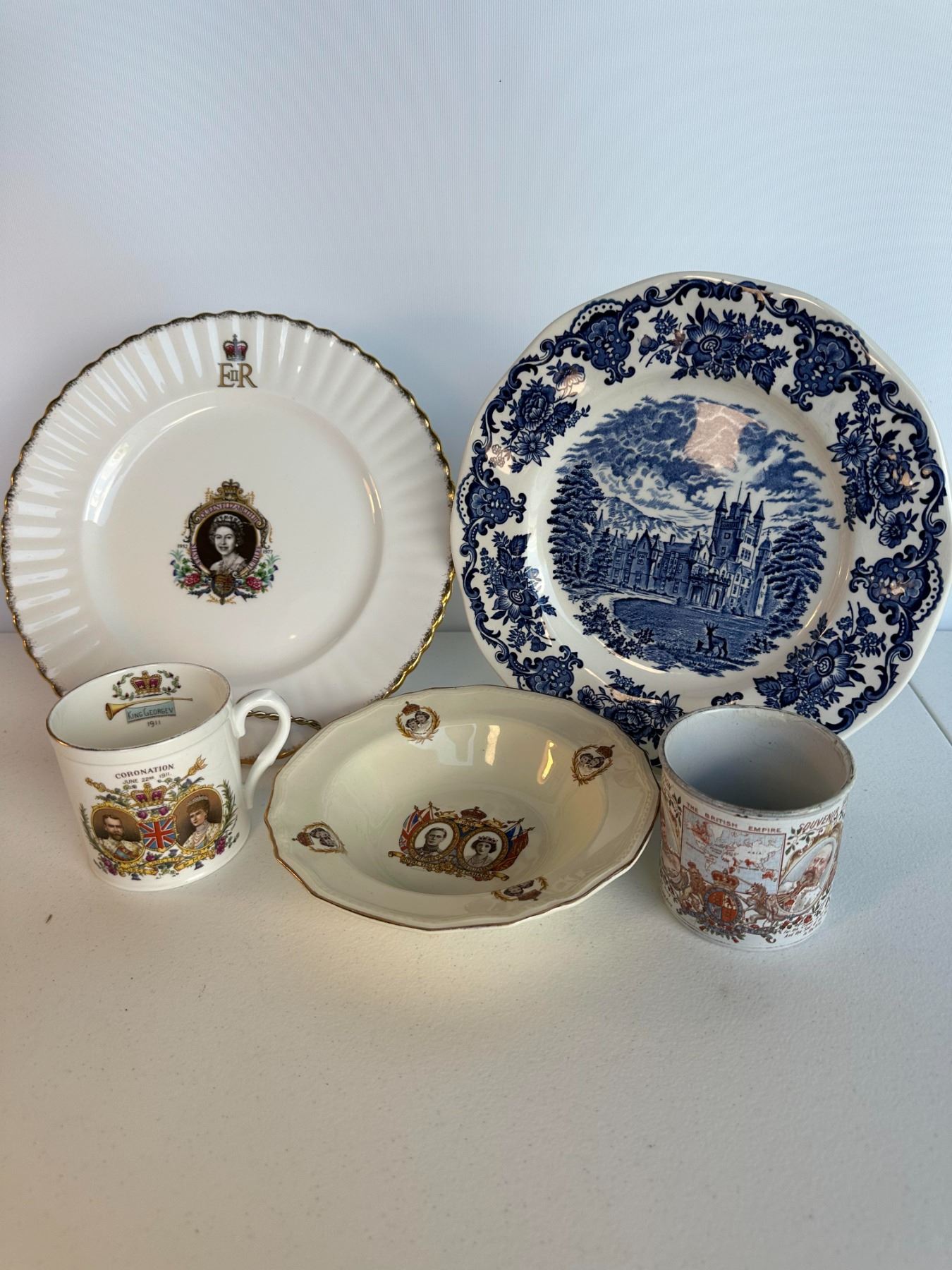 Grouping includes Queen Elizabeth II coronation plate, blue transferware castle plate, 1937 King George VI coronation cup, royal portrait bowl, and Empire mug.