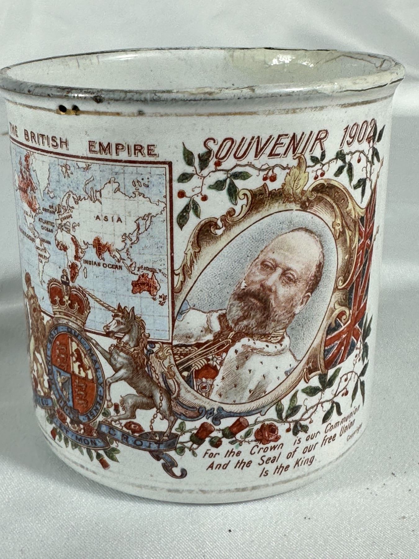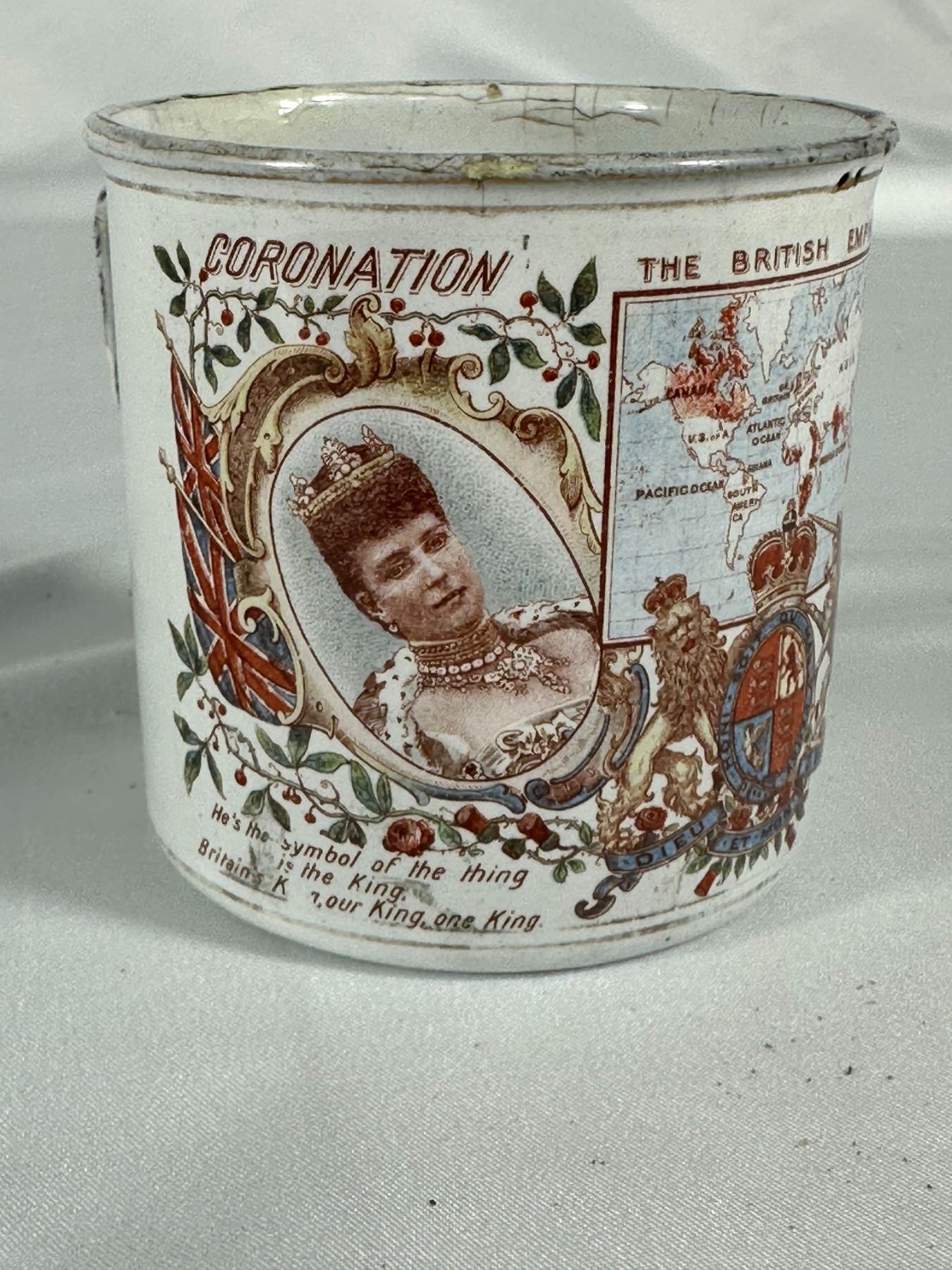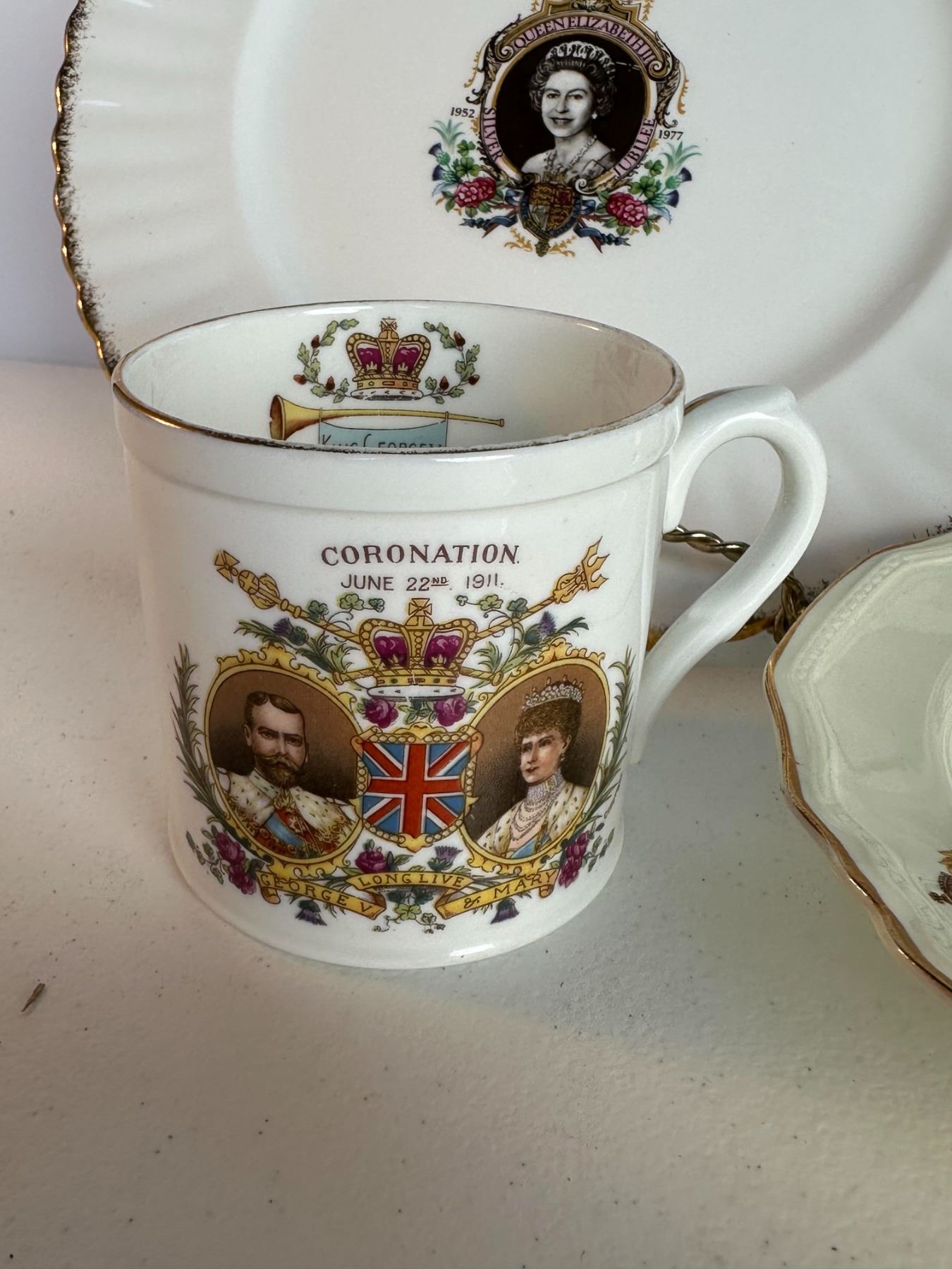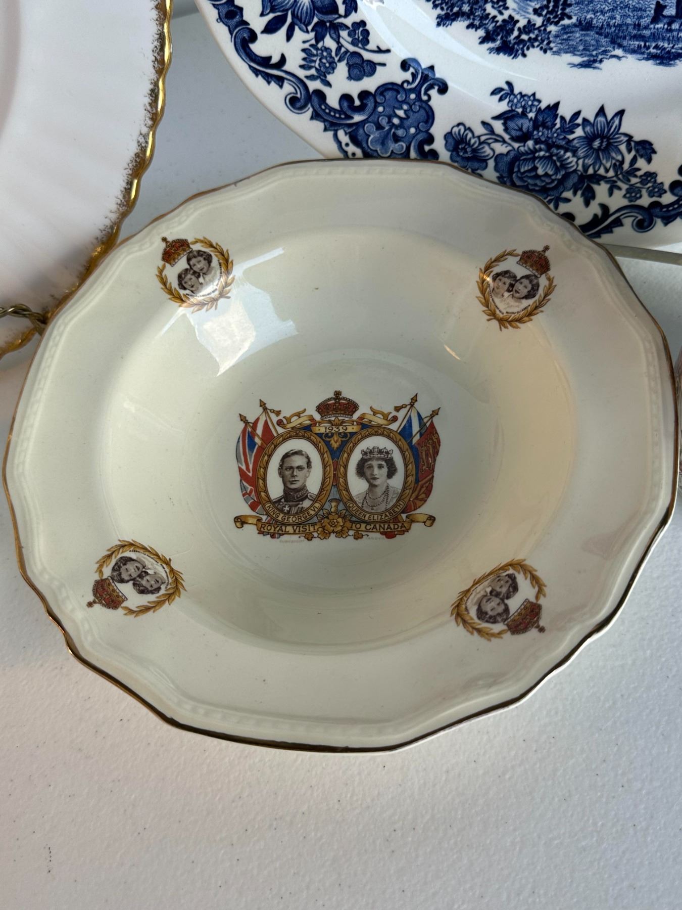 Grouping includes Queen Elizabeth II coronation plate, blue transferware castle plate, 1937 King George VI coronation cup, royal portrait bowl, and Empire mug.