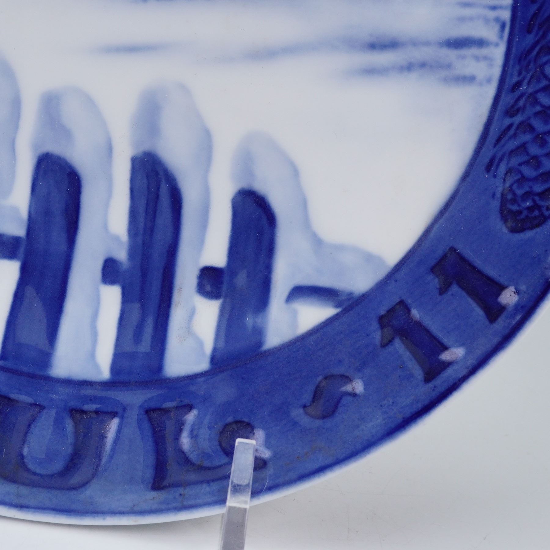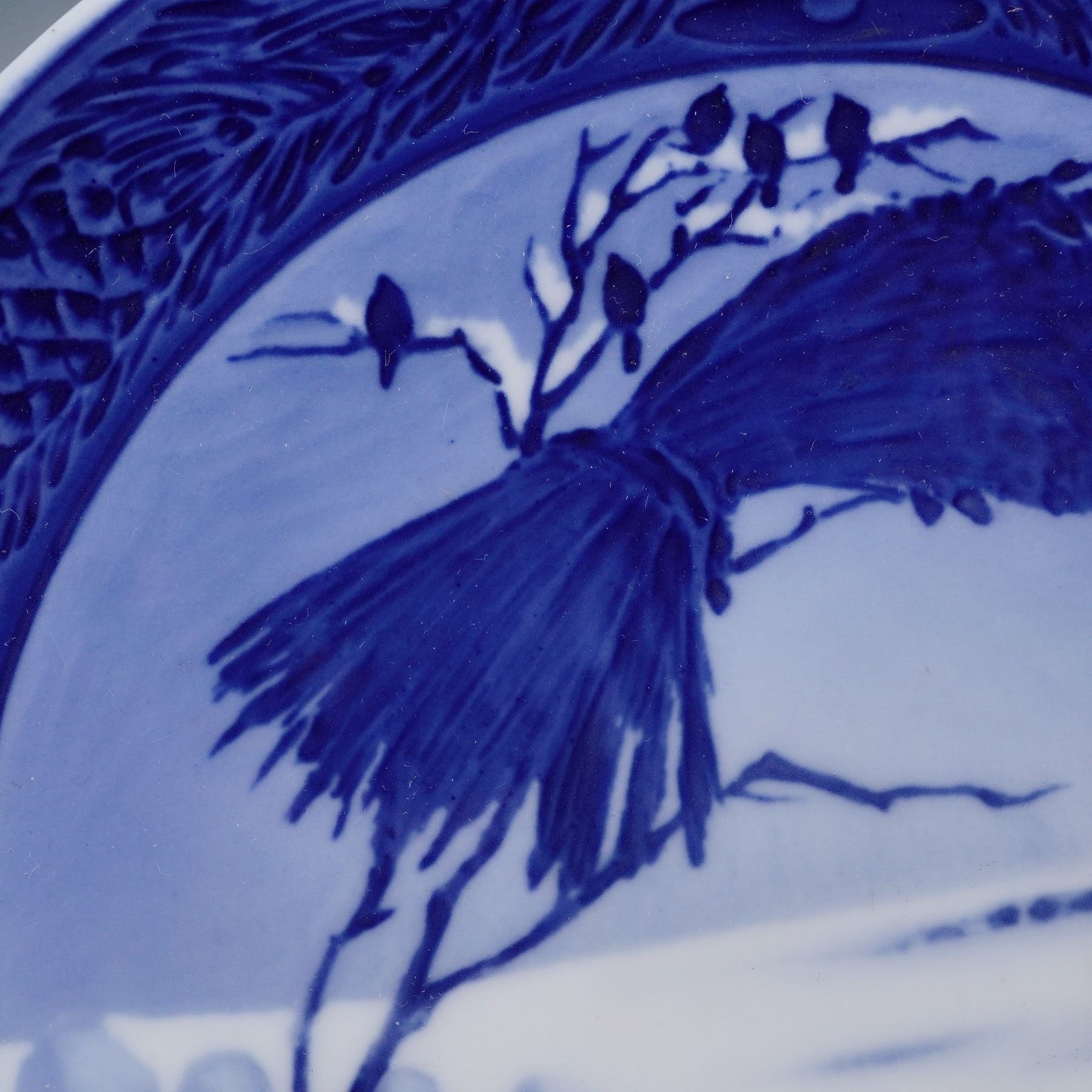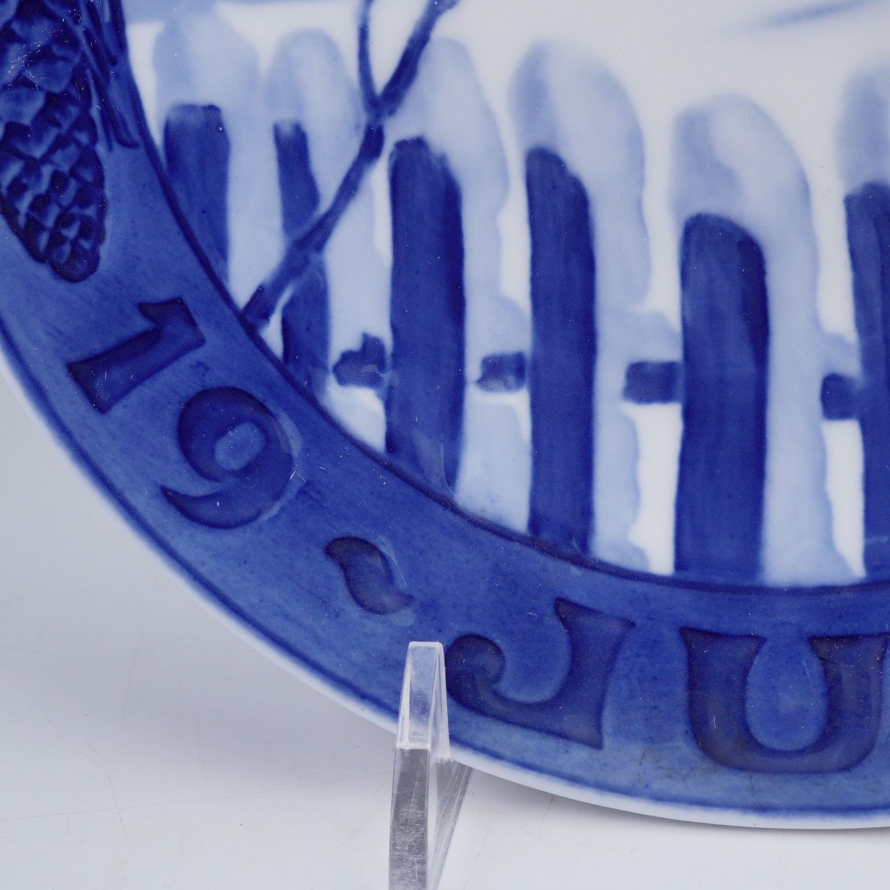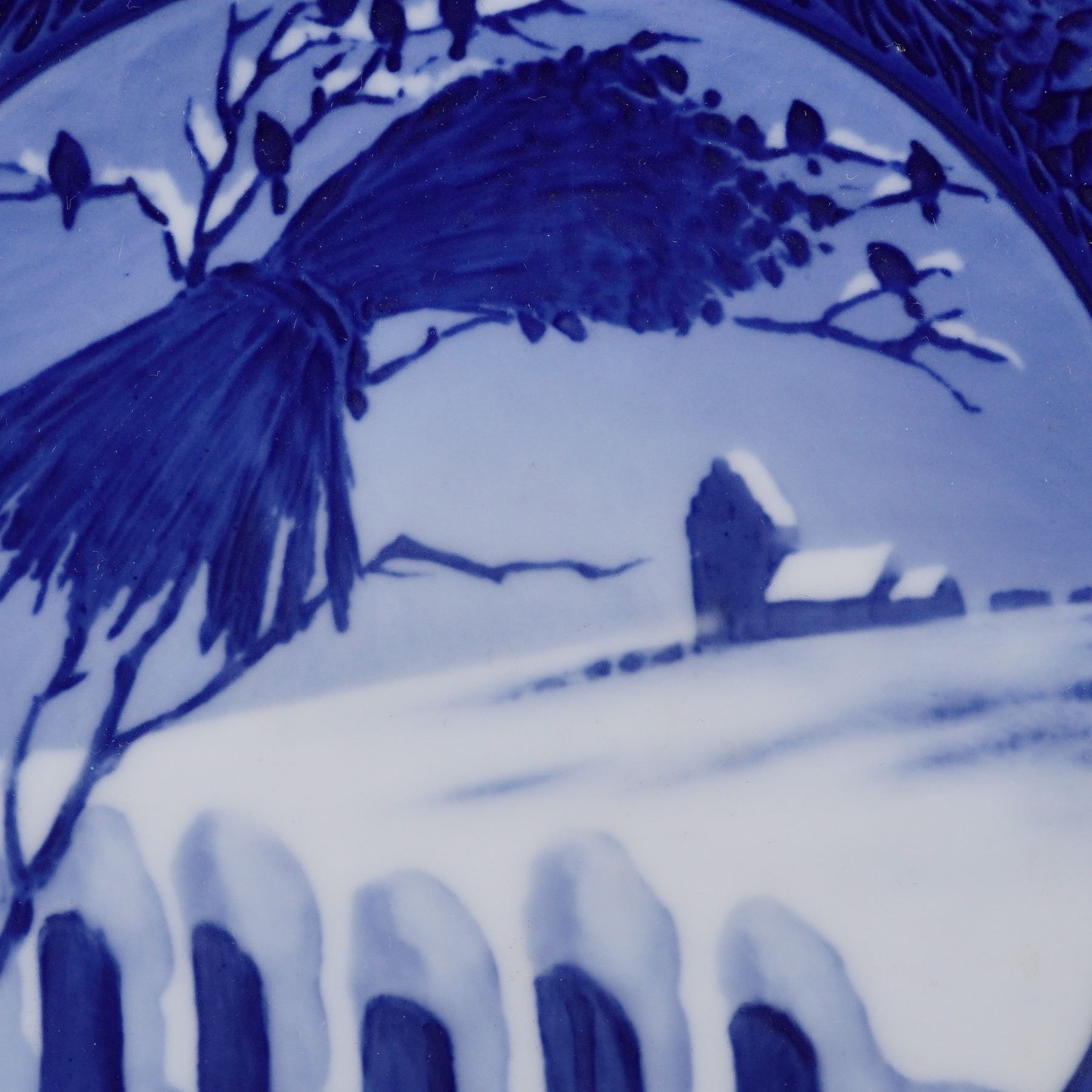 A commemorative decorative plate, hand-painted in blue and white porcelain. The central scene depicts a snowy rural landscape with a sheaf of corn tied to a tree branch, surrounded by perched birds, a picket fence in the foreground, and a farmhouse in the distance. The border is decorated with pine cones and branches, prominently molded and painted along the lower rim. The reverse bears the Royal Copenhagen hallmark with three wavy lines and painter's mark.