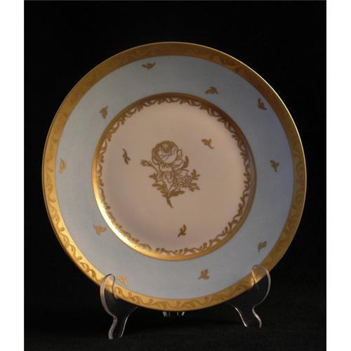 Fine Royal Copenhagen porcelain cabinet in shades of light blue and gold. It is marked on the underside with the Royal Copenhagen mark with a bar above the letter H in Copenhagen. This means it was made in 1945. In very good condition with minor signs of wear as shown. Please ask questions, request additional photos and shipping costs before buying. Acrylic stand is for display purposes only and not included.