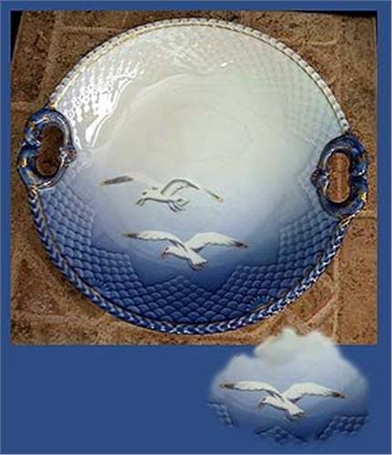 Royal Copenhagen Seagull handled round plate with dolphin handles. Measures 10 1/2" across handles. No chips or cracks