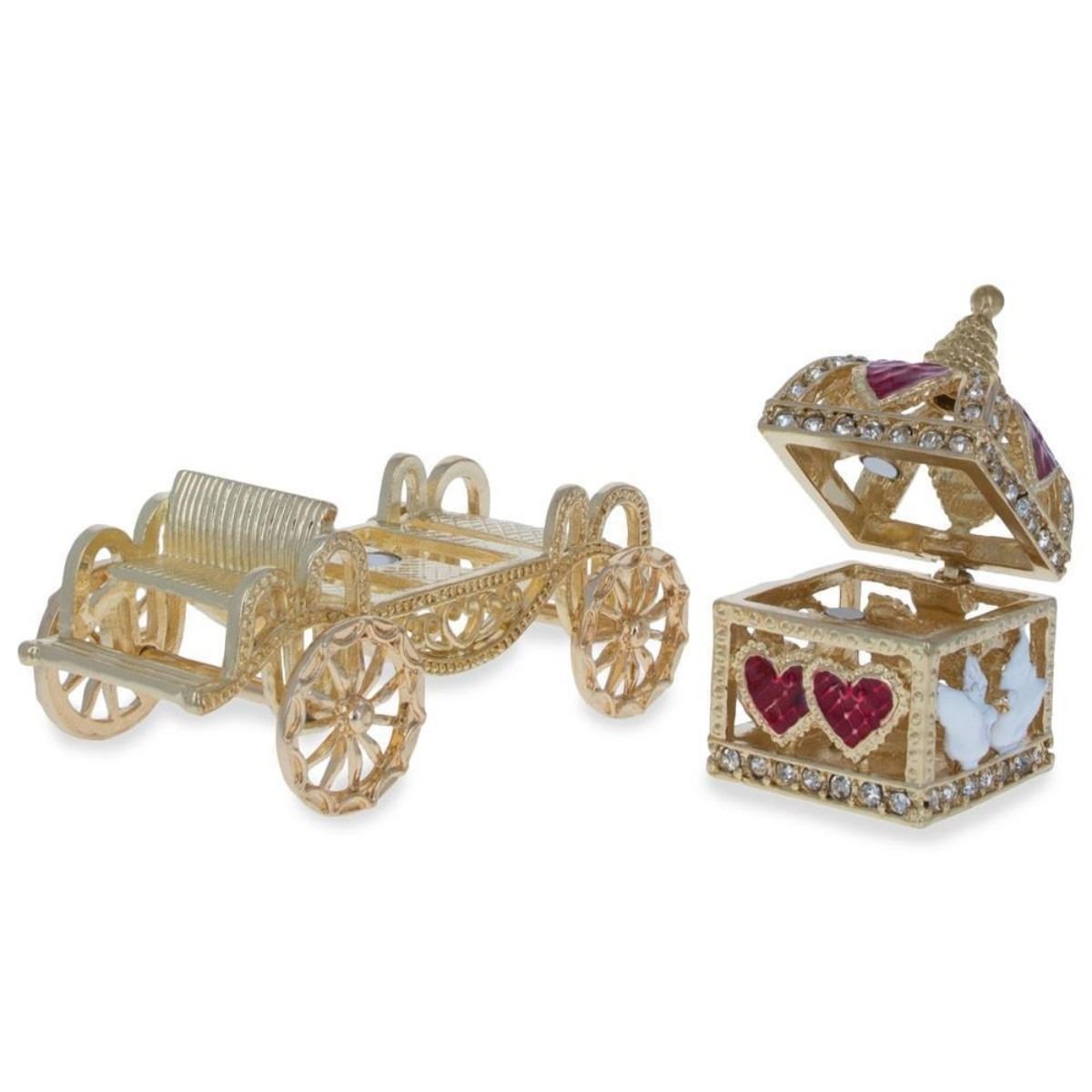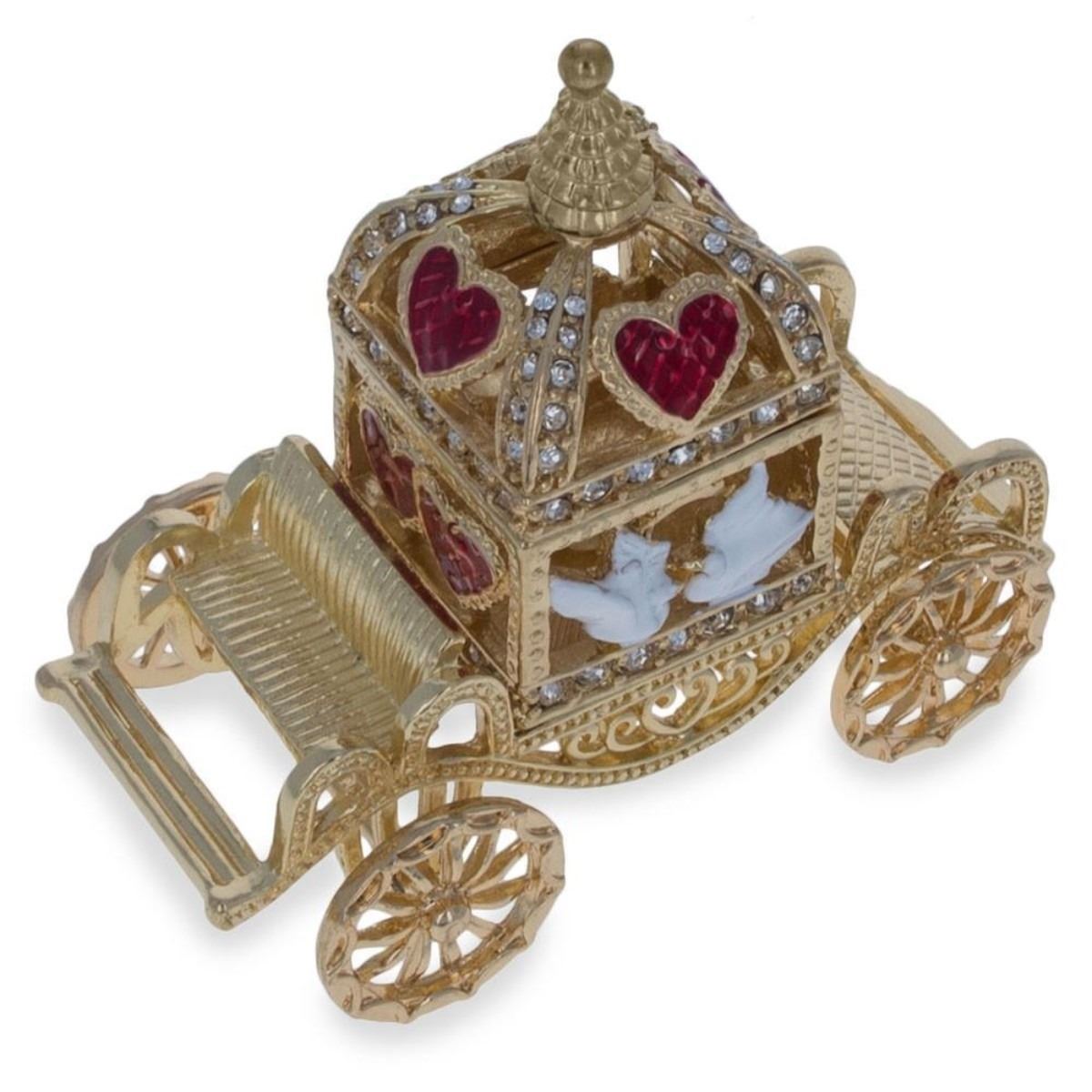 3.25" Royal Coronation Coach with Doves Trinket Box Figurine 3.25 Inches Tall Enamel Gold Plated Pewter, Austrian Crystals Hand Painted Gift Boxed Imported You'll love the elegance of this golden-hued, royal coach trinket box. Fashioned from fine pewter. Then it is hand enameled by our skilled artisans. It opens on a hinge and has a magnetic closure to keep the box securely shut. The piece also comes in a beautiful gift box.