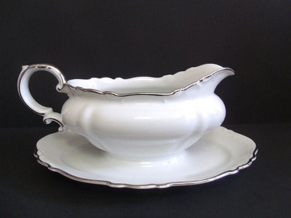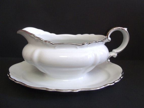 Royal Crest Gravy Boat with Attached Underplate, White **|**|** Royal Crest Gravy Boat with Attached Underplate, White and Platinum, Lady Royal, Embossed Vintage item from the 1980s Material: Porcelain
