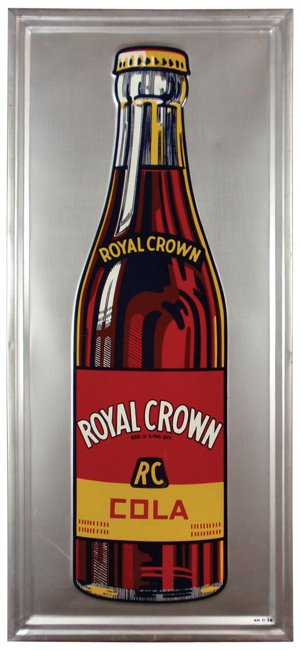 Royal Crown Cola sign, embossed metal self-framed sign w/bottle center on silver background, dated 1