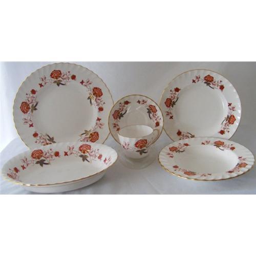 11 Salad Plates 8.1/2" across. 6 are dated 1968, 3 are dated 1971, 1 is dated 1978 and 1 is dated 1967. VERY lightly used, some never used. 9 Flat Rimmed Soup bowls. 8.1/2" across with a 1.1/2" rim and a 5" soup indentation which is 1.1/2" deep. 6 are dated 1974, 2 are dated 1973 and 1 is dated 1972. VERY slightly used, most never used. 2 Oval Open Vegetable Bowls. 10.1/4" X 7.3/4" by 2.1/4" deep. 1 is dated 1972 and 1 is dated 1973. 11 cups, flat bottomed, 2.3/4" tall. 6 are dated 1971, 2 are dated 1974, 2 are dated 1975 and 1 is dated 1970. Very lightly used, some never used. 3 saucers, 5.5/8" across. 2 are dated 1970 and 1 is dated 1974. Very lightly used. I am selling this as a set, however I have broken down the cost of each item as follows. Dinner Plates $35 each, Salad Plates $30 each, Soup Plates $50 each, Open Veg $80 each, Cups $20 each and Saucers $10 each.The condition is VERY slightly used, most pieces not at all.